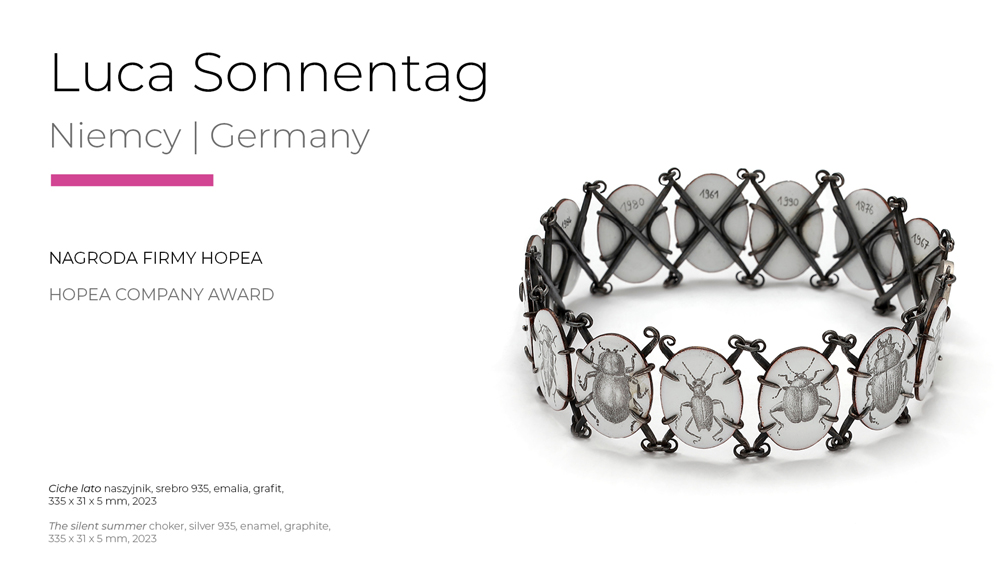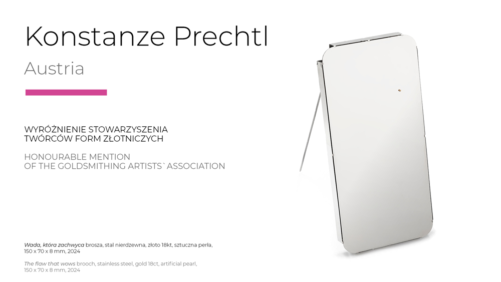 Tegoroczny poziom legnickiej wystawy potwierdza jej znaczenie jako wiodącego wydarzenia w obszarze biżuterii artystycznej w Europie. Świadczy o tym nie tylko liczba nadesłanych prac, ale także jakość oraz stylistyczna i wykonawcza różnorodność zakwalifikowanych do wystawy oraz nagrodzonych obiektów. Z pewnością każdy z odwiedzających wystawę odszuka na niej swój własny „efekt WOW!” Warto uważnie przyjrzeć się pracy, która otrzymała Grand Prix – autorstwa austriackiej artystki Konstanze Prechtl. To nie tylko mądrze skonstruowany przedmiot, wykonany przy pomocy innowacyjnej, przemysłowej technologii cięcia laserowego, ale także dający do myślenia komentarz dotyczący styku świata rzeczywistego i cyfrowego ze świadomie zaprojektowaną, rozpraszającą skazą, odciągającą uwagę od wyświetlacza, przez który oglądamy dzisiaj świat. To zaproszenie do choćby chwilowego wylogowania się, koncentracji i powrotu do materialnej rzeczywistości – podsumował prof. Sławomir Fijałkowski, jeden z jurorów tegorocznego konkursu.