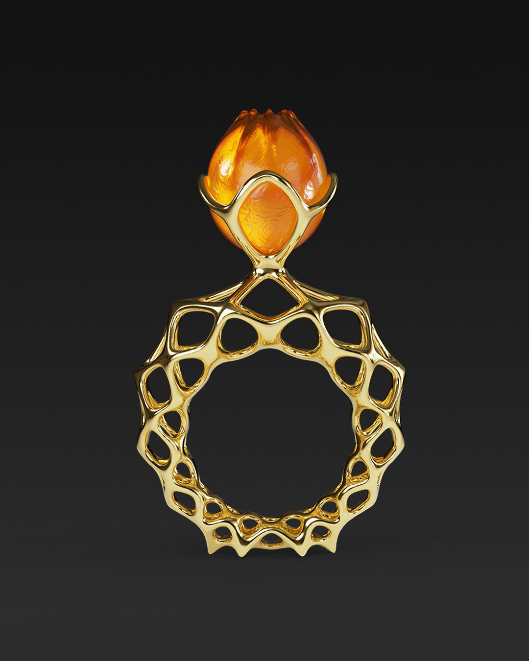 Martyna Golińska, pierścionek, bursztyn, srebro złocone (CAD - CAM)