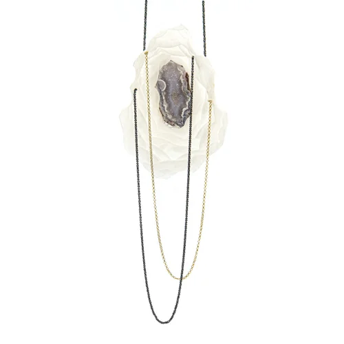 Rzadkie w biżuterii połączenie agatu z bursztynem bałtyckim – kamieni, które zachwycają mnogością odmian barwnych oraz intensywnością ukrytych w ich wnętrzach obrazów. Ich pełne wyczucia zestawienie w nieoczywistej formie czyni ten wspólny obraz nadzwyczaj sensorycznym.