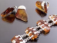 Komplet biżuterii z serii „Riveted”. Nowatorskim rozwiązaniem jest tu pomysł na łączenie bursztynu ze srebrem za pomocą nitów, a nie tradycyjnego zakuwania bądź wklejania kamienia.