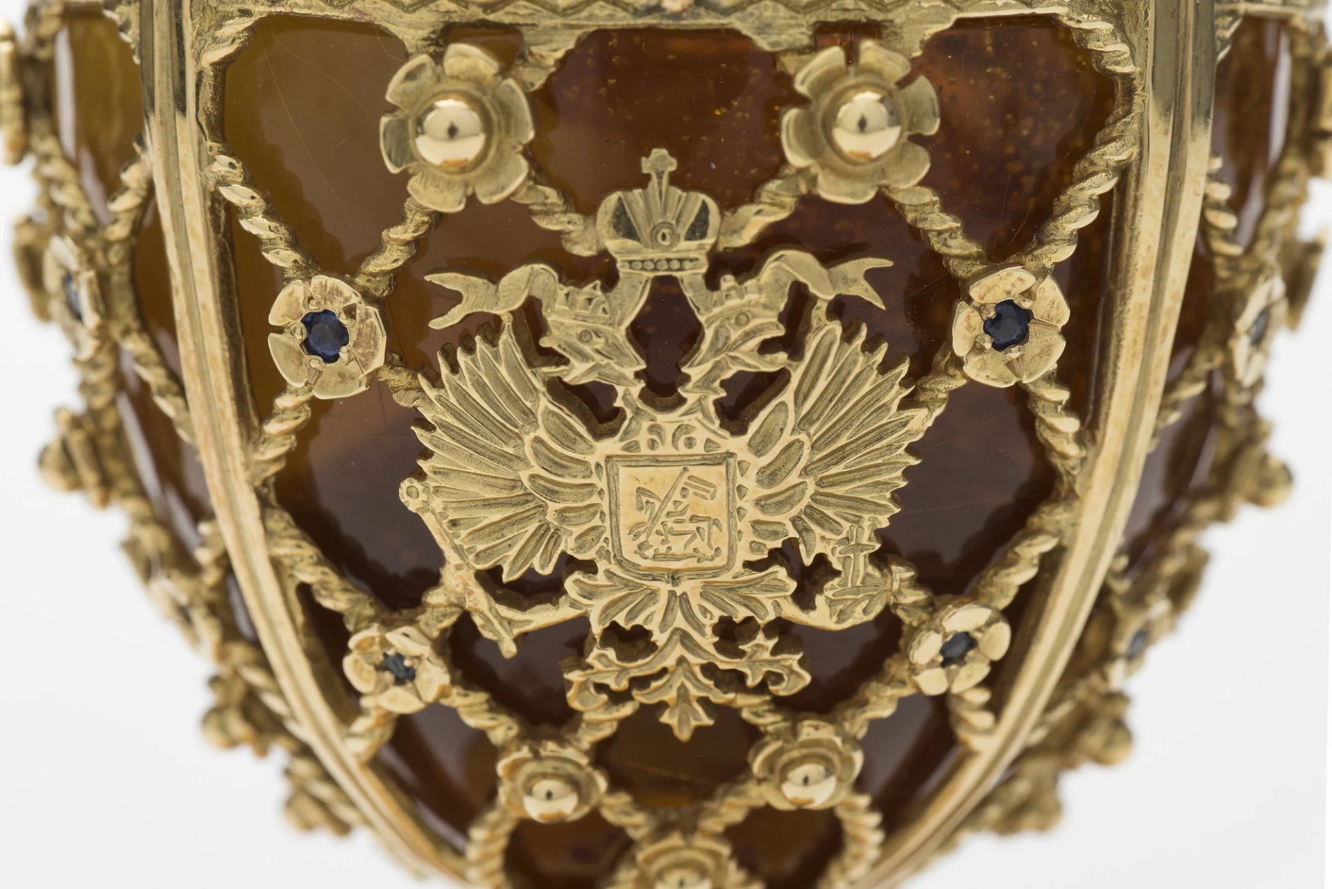 Centralnym elementem Bursztynowego Jaja Faberge jest oczywiście bursztyn – z niego zostały wykonane znajdujące się we wnętrzu ażurowego koszyka duże jajko oraz małe, które kryje w sobie inkluzję, pod jego pokrywką. Bursztynowa jest także podstawa oparta na czterech głowach gdańskich lwów. Z jednej strony koszyczka widnieje herb Gdańska – dwa równoramienne, srebrne krzyże ze złotą, otwartą koroną powyżej, z drugiej zaś dwugłowy orzeł – herb dynastii Romanowów. Ciepłą barwę bursztynu podkreśla oprawa z żółtego złota próby 750 zdobiona brylantami, rubinami i szafirami.