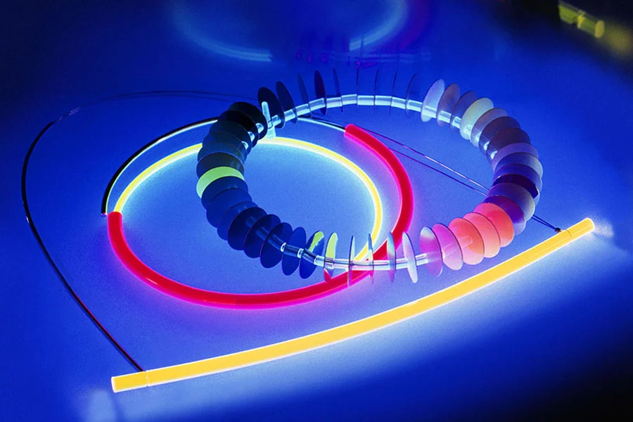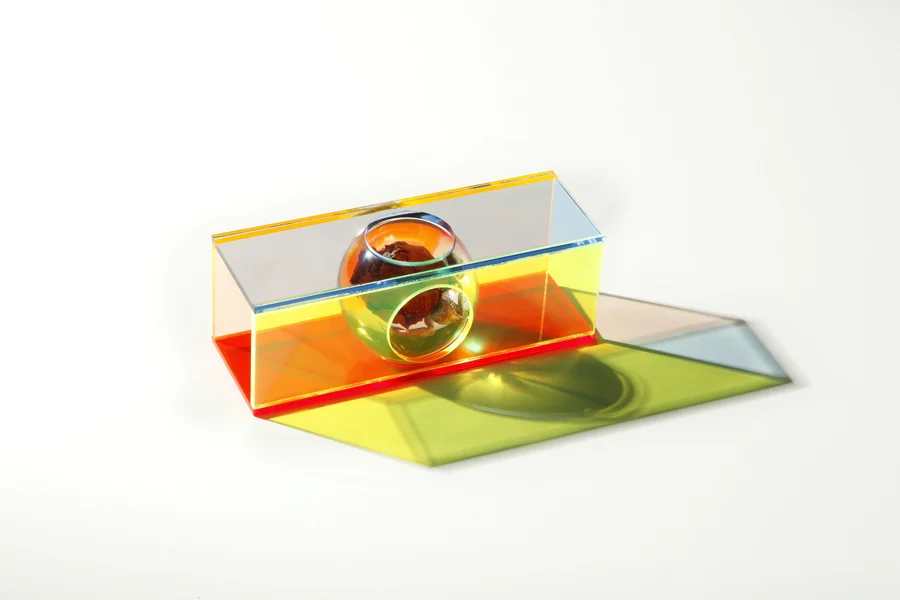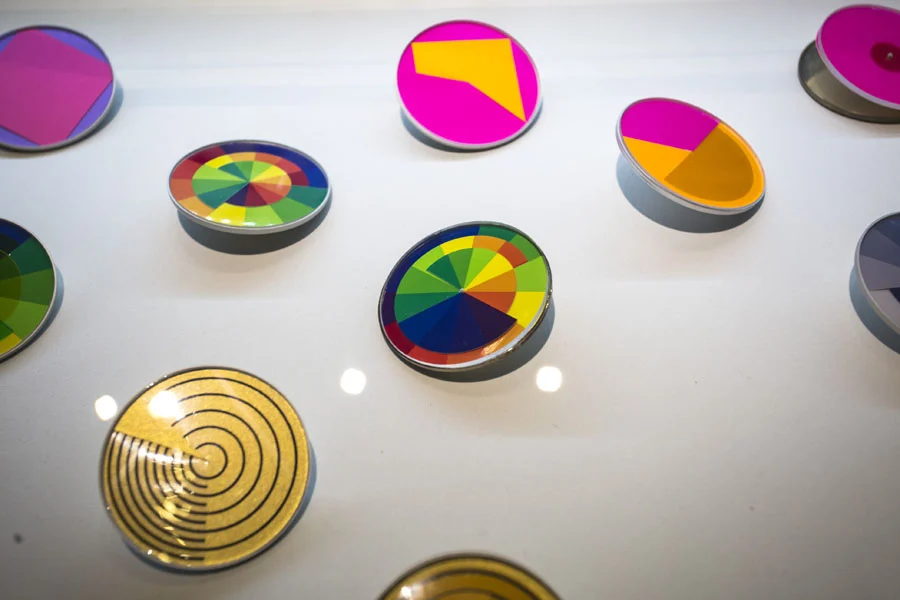 Cykle tematyczne są na tej wystawie o tyle istotne, że pokazuję gotowe prace w zestawieniu z rysunkami projektowymi oraz zdjęciami – wydaje mi się, że jest to mocno przekonujący sposób prezentacji. Jednym z nich jest serwis do kawy „Łódź 1979”. Współczesny design dopiero teraz dochodzi do takich założeń i uwzględnia to, co ja już wiele lat temu zastosowałem, tj. wykorzystanie wszystkich wytłoczeń jako odpadów w kolejnych dodatkowych przedmiotach użytkowych takich jak popielniczki, świeczniki, naczynia do ikebany i inne, które mogą uzupełnić prezentację kolekcji. Najmocniej rozbudowanym cyklem – i rzeczywiście najbardziej znanym – są „Art Systemy”, czyli brosze w kształcie koła, które łączą w sobie elementy grafiki i zabawy materiałem. To układ wielu płaszczyzn kolorystycznych, które mogą zmieniać swoje usytuowanie względem centralnego punktu lub wskutek zmian na promieniu koła – w ten sposób za każdym razem tworzą inną kompozycję.