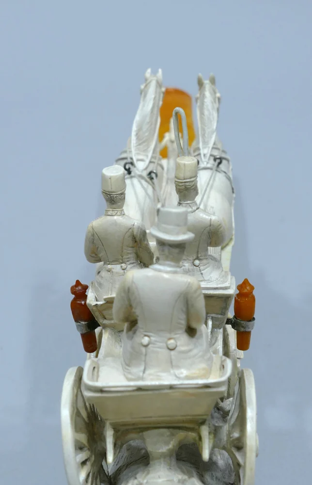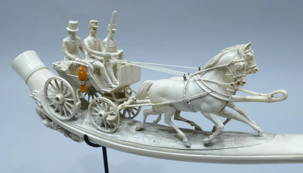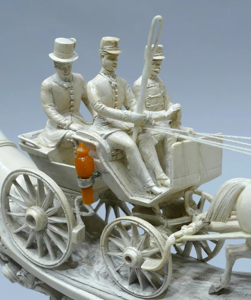Wyjątkowo efektowna cygarniczka składa się z bursztynowego ustnika i precyzyjnie rzeźbionego w piance morskiej (sepiolicie) kominka przedstawiającego arcyksięcia Rudolfa Habsburga siedzącego w powozie zaprzężonym w dwa konie powożonym przez woźnicę i wojskowego z orderami. Rozbudowana, dynamiczna grupa prezentuje bardzo wysoki poziom artystyczny i realistycznie sportretowane postacie. Po bokach powozu zamocowane zostały za pomocą srebrnych obręczy bursztynowe latarnie. W dolnej części kominka, pod kołami powozu, wyrzeźbiony został herb Habsburgów – dwugłowy orzeł.