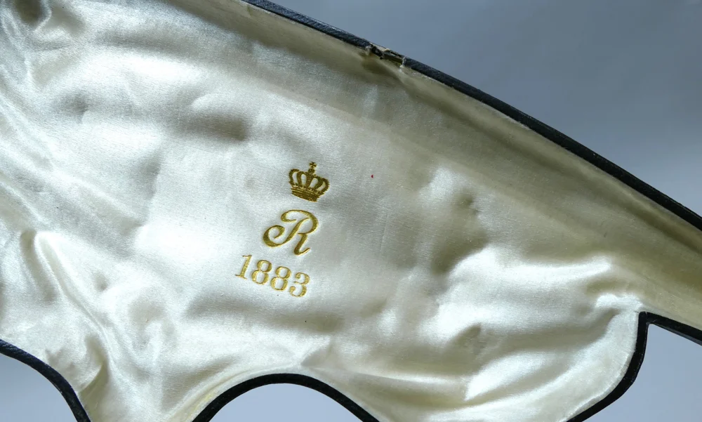 Cygarniczka znajduje się w oryginalnym skórzanym etui ze złotą literą ,,R” i koroną. Jego wnętrze zostało wyłożone niebieskim aksamitem i białym jedwabiem również ze złotą literą ,,R” i koroną oraz datą „1883”.