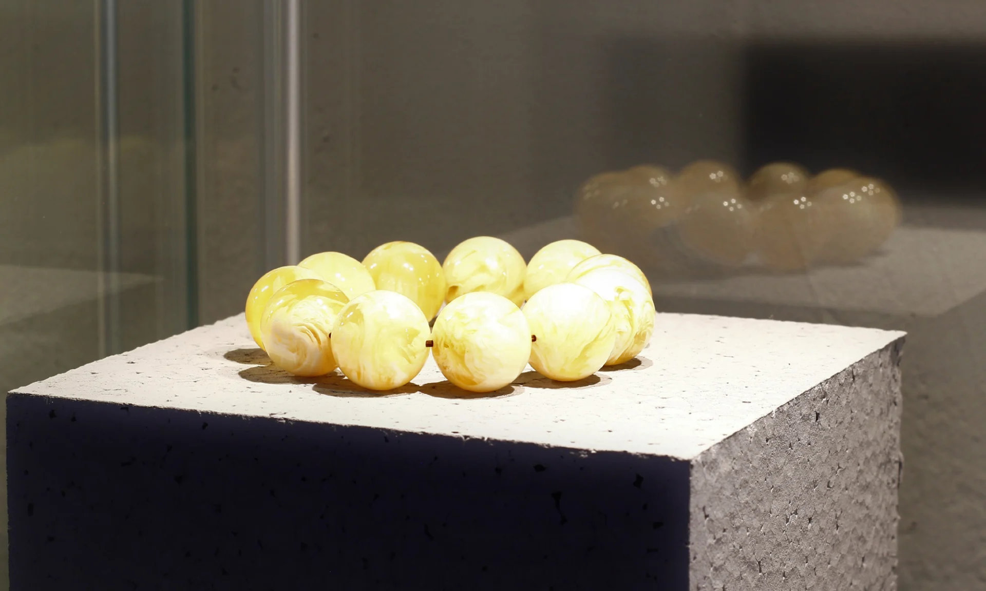 Na wystawie prezentowane są głównie imitacje bursztynu wykonane z żywic fenolowo-formaldehydowych, tj. rezolanu, żywic epoksydowych oraz poliestrowych – ta ostatnia grupa wraz z żywicami epoksydowymi stanowi obecnie jeden z najczęściej wykorzystywanych materiałów. Zobaczymy m.in. broszki z rezolanu, bransolety z żywicy epoksydowej czy naszyjniki z poliestru – często do złudzenia przypominające bursztyn. Dla porównania pokazano także wyroby ze szkła – substancji nieorganicznej w odróżnieniu od wyżej wymienionych żywic syntetycznych i najstarszego materiału, z którego wykonywane były i są imitacje bursztynu bałtyckiego.