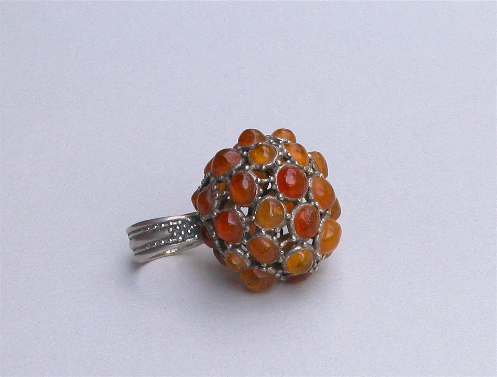 Zupełnie odmienne pojmowanie sposobu kreowania artystycznej biżuterii pokazuje dorobek jednej z najciekawszych indywidualności twórczych 2 poł. XX w. Jolanty Ołdachowskiej-Ryby. Słowo klejnot zdaje się być najbardziej adekwatnym dla określenia jej prac, niezwykle ozdobnych, o rozbudowanych formach, bogato kameryzowanych, a przy tym delikatnych, finezyjnych, niemal koronkowych. Ciekawe efekty osiągnęła posługując się znaną od starożytności techniką odlewu na wosk tracony, dzięki której precyzyjny ornament srebrny z drobnymi kuleczkami stanowi ażurową oprawę dla kameryzacji. Obok turkusów, korali, granatów, ametystów czy macicy perłowej, autorka chętnie stosowała w swoich pracach bursztyn. Najczęściej zestawiany z ażurową oprawą, za sprawą której światło stawało się znaczącym elementem kształtowania bryły przedmiotu. Muzeum Sztuki Złotniczej posiada w swych zbiorach niezwykły pierścień z 1974 r., w którym na szynie, ozdobionej wspomnianym rodzajem granulacji, osadzony jest pokaźnych rozmiarów ( średn. 4,2 cm) pełnoprzestrzenny, ażurowy, kulisty guz, ozdobiony ponad trzydziestoma owalnymi oszlifowanymi bursztynami o różnym stopniu nasycenia koloru, od barwy żółto-złotej po brązowo-złotą. Pierścień z ową kulą koronkową, emanującą ciepłem podświetlonego, przeźroczystego bursztynu, został zaopatrzony przez autorkę, jakże trafnym tytułem  „Słoneczko”.