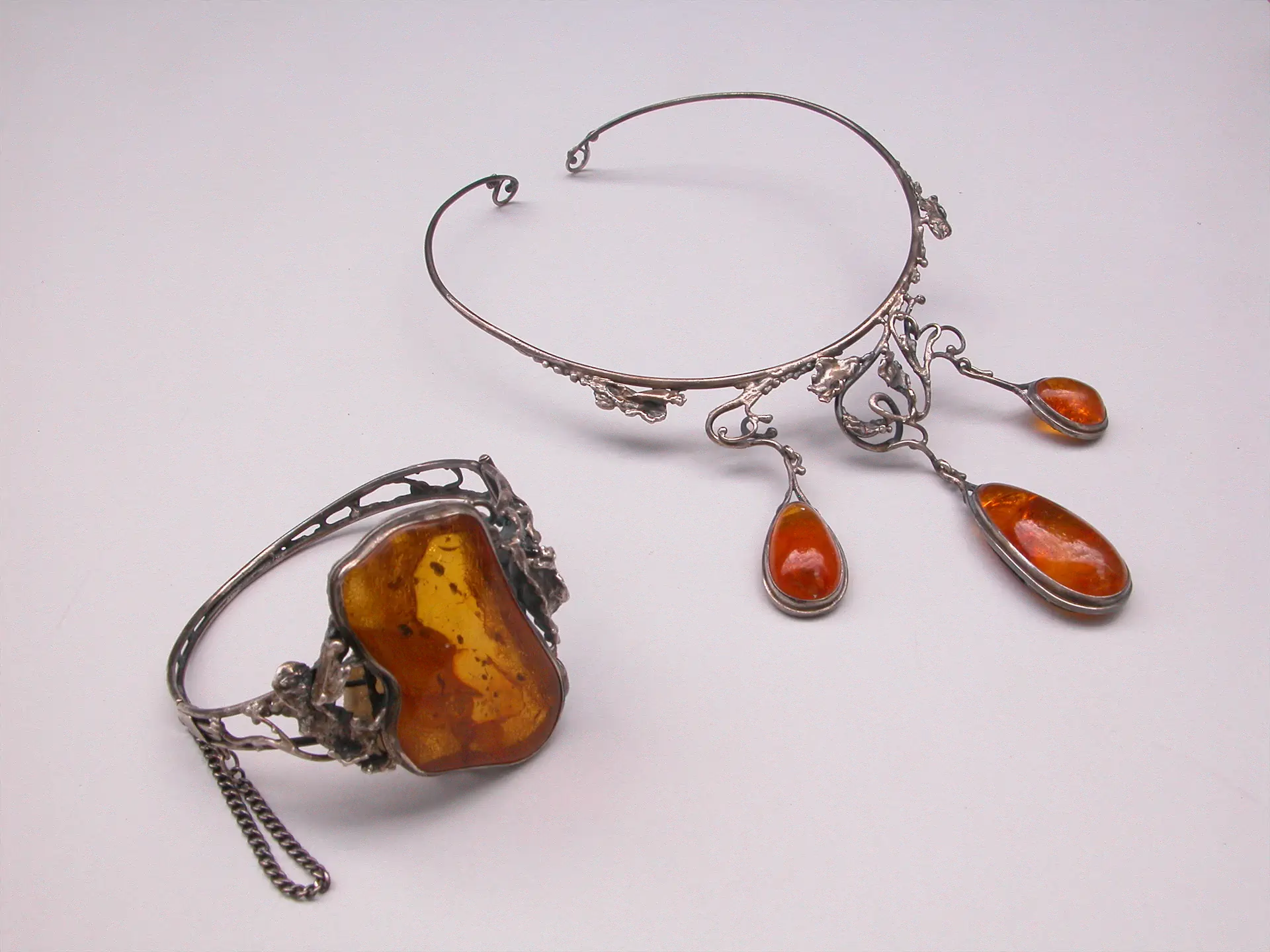 Istotny wpływ na kierunki poszukiwań w dziedzinie biżuterii z bursztynem w rzeczywistości lat 60., zwłaszcza północnej Polski, miała twórczość Marii i Pawła Fietkiewiczów. Nie ulegając tendencjom produkowania tandetnej masówki, zaczęli oni tworzyć niezbyt drogie – zarówno przez wzgląd na niewielkie przydziały srebra, jak i mało zasobne kieszenie odbiorców – ale ambitne artystycznie przedmioty biżuteryjne z bursztynem oprawnym w srebro. Zawsze o unikatowych formach, traktowane za każdym razem indywidualnie, często z uwzględnieniem specyficznych upodobań zamawiającego. W ich twórczości pobrzmiewają echa technik dawnych mistrzów, zwłaszcza w opracowanym przez Pawła Fietkiewicza autorskim sposobie wielowarstwowej srebrnej oprawy, zwanym techniką zwielokrotnionej cargi. Dla podkreślenia walorów bursztynu, dla wydobycia za każdym razem jego formy, koloru i przejrzystości, wykorzystywali też inną własną, autorską technikę oprawy bursztynu w srebrze – metodę „z ognia”. Ta termiczna technika, dająca szerokie możliwości wyeksponowania walorów i jednoczesnego ukrycia ewentualnych niedostatków bryłek bursztynu, znalazła później bardzo licznych, niestety często nieudolnych naśladowców, co w efekcie przyniosło pewne zdeprecjonowanie bursztynu. Jednak na to Fietkiewiczowie – których niewątpliwą zasługą jest upowszechnienie traktowania biżuterii z bursztynem jako dzieła sztuki – wpływu już mieć nie mogli. Wśród zgromadzonych  w Muzeum Sztuki Złotniczej prac Marii i Pawła Fietkiewiczów dwie z nich, pochodzące już  lat 80., zostały wykonane z użyciem technik termicznych. To obroża „z trzema wisiorami” oraz bransoleta przypominająca wyglądem wielki pierścień z dużym (6,5 cm), płaskim, zeszlifowanym, przezroczystym bursztynem o nieregularnym wykroju.