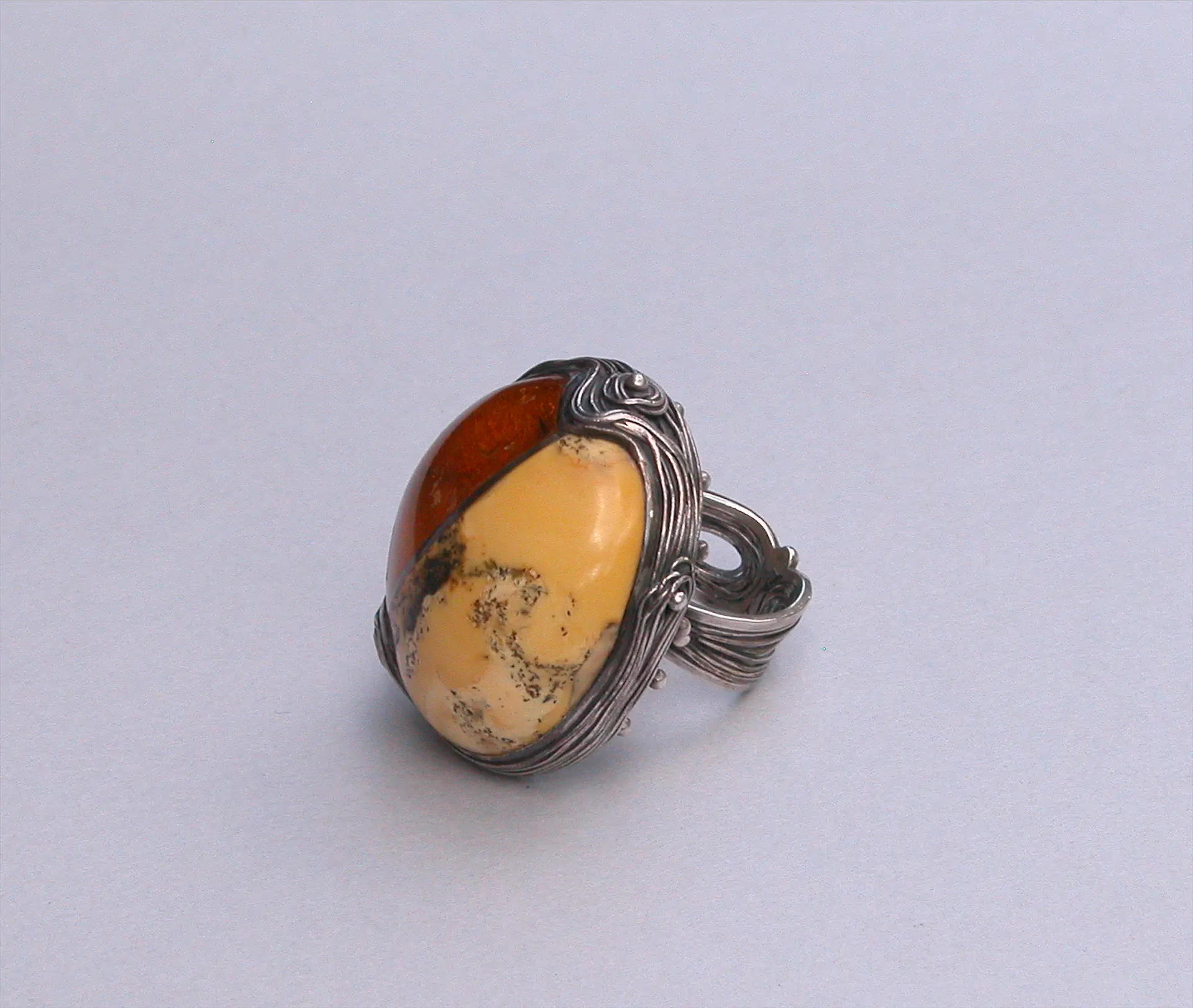 W 2001 roku Danuta Kobielska – artystka, której oryginalność twórcza stawia ją na jednym z najbardziej czołowych miejsc wśród powojennych twórców biżuterii – przekazała w darze Muzeum Sztuki Złotniczej liczący blisko 50 obiektów zespół biżuterii srebrnej, głównie z lat 60.  i 70., autorstwa Danuty i Szczęsnego Kobielskich. Mimo iż wśród nich znajduje się zaledwie kilka prac z bursztynem, stanowią ważną i cenną część tej kolekcji, dobrze ilustrując tak charakterystyczny styl, wypracowany w efekcie wnikliwych poszukiwań własnego, indywidualnego języka wypowiedzi. Jego znamienną cechą jest tworzenie unikatowych form z wijącego się, cienkiego drutu srebrnego, którym artystka operuje jak kreską w rysunku, co ma swoją genezę w jej doświadczeniach z czasów studiów (z wykształcenia bowiem jest architektem), a zwłaszcza w wyniesionym z zajęć rysunku sposobie nadawania kształtu przedmiotom za pomocą nakładających się na siebie płynnych linii. W tej biżuterii, perfekcyjnej warsztatowo, kamienie jubilerskie oplecione są drutem srebrnym, najczęściej kładzionym w pasma o miękkich, falistych liniach, pełniące zarówno funkcję konstrukcyjną, jak i dekoracyjną, tak jak w pierścieniu z dwoma połączonymi bryłami mleczno-żółtego i miodowego bursztynu. Prace te budzą skojarzenia ze światem podwodnej flory, zwłaszcza gdy pasma, niczym glony morskie wiją się wokół chętnie używanych przez artystkę muszli, pereł, korali, czy właśnie bursztynów. Częstym elementem wzbogacającym ten rodzaj współczesnego filigranu jest granulacja w postaci nieregularnie rozsianych srebrnych kuleczek, które niczym pęcherzyki powietrza pod wodą przycupnęły między wijącymi się, płynnie falującymi  podwodnymi lianami.
