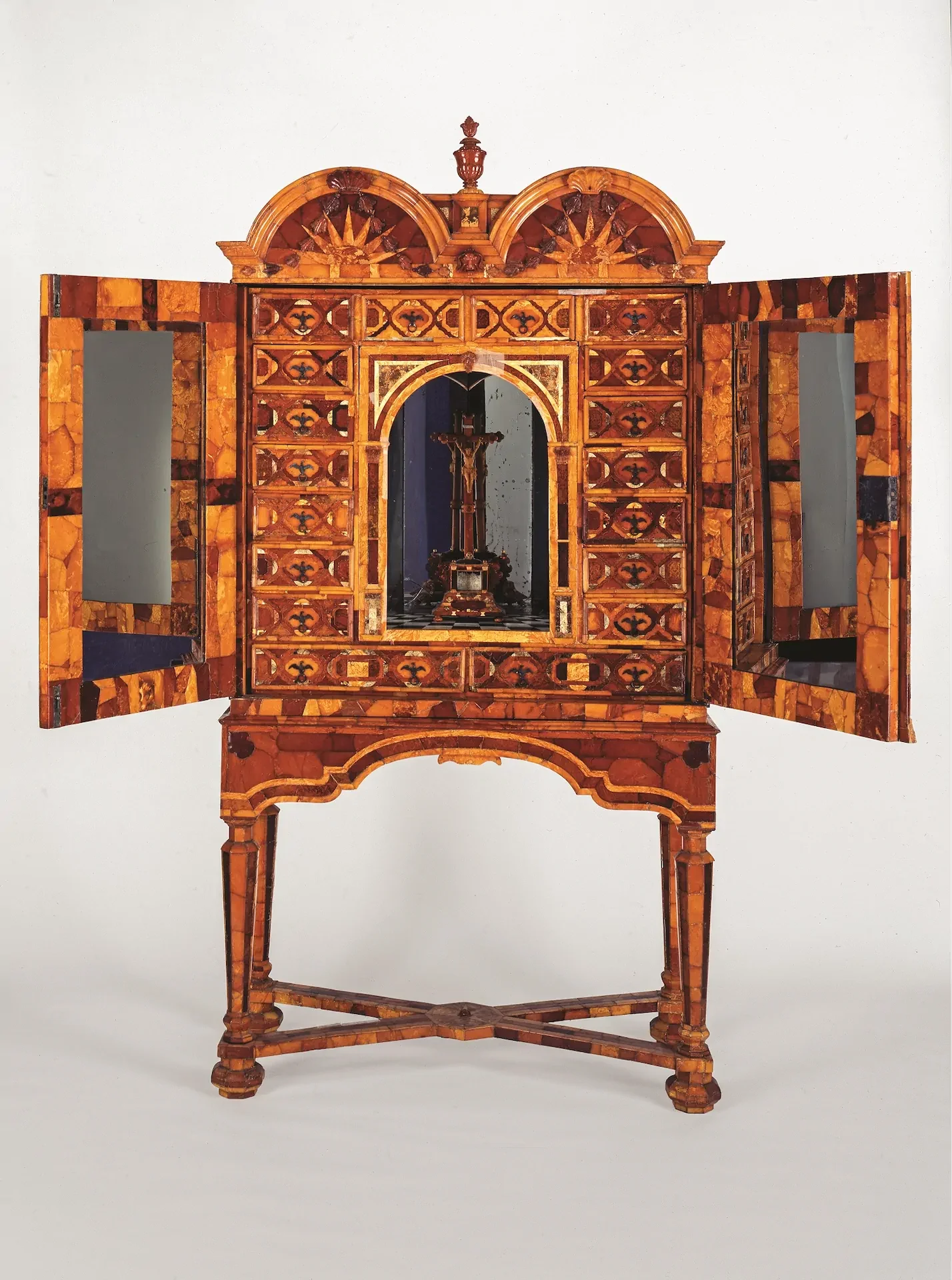 Przekształcenie zbiorów Grünes Gewölbe znajdujących się na parterze pałacu w Dreźnie, z ekskluzywnego, mniej lub bardziej prywatnego skarbca, w muzeum książęce i królewskie rozpoczęło się latem 1723 roku. Całość pomieszczeń zaprojektowano w scenografii teatralnej: prezentację kolekcji oparto na materiałach, z których zostały wykonane przedmioty, a sale o różnych rozmiarach zostały dostosowane – zarówno w barwie, jak i wystroju – do eksponatów (kość słoniowa, srebro, precjoza, herby, biżuteria, brązy). Była to koncepcja jedyna w swoim rodzaju, dzięki której zbiory Grünes Gewölbe zyskały światową sławę. Gdy 5 stycznia 1725 r. król August II podpisał księgę inwentarzową tzw. Sali Precjozów Skarbca, w której wymieniono także kolekcję bursztynu, pierwszy etap budowy Skarbca uznano za zakończony. Sala Precjozów ma największą powierzchnię: 200 m2. Jest to wystawne pomieszczenie prawie w całości wyłożone lustrami nadającymi mu niemal bajkowy wygląd dzięki pozornie niekończącym się odbiciom lustrzanym. I tak znajdują się tam rozmaite panele ścienne przeznaczone do różnego rodzaju naczyń z kamieni szlachetnych, kryształu górskiego, muszli łodzików i ślimaków turbanów, masy perłowej i jaj strusich. Pierwotnie wąski panel między naczyniami z kamieni, masy perłowej i jaj strusich służył do prezentacji prestiżowej kolekcji bursztynu.