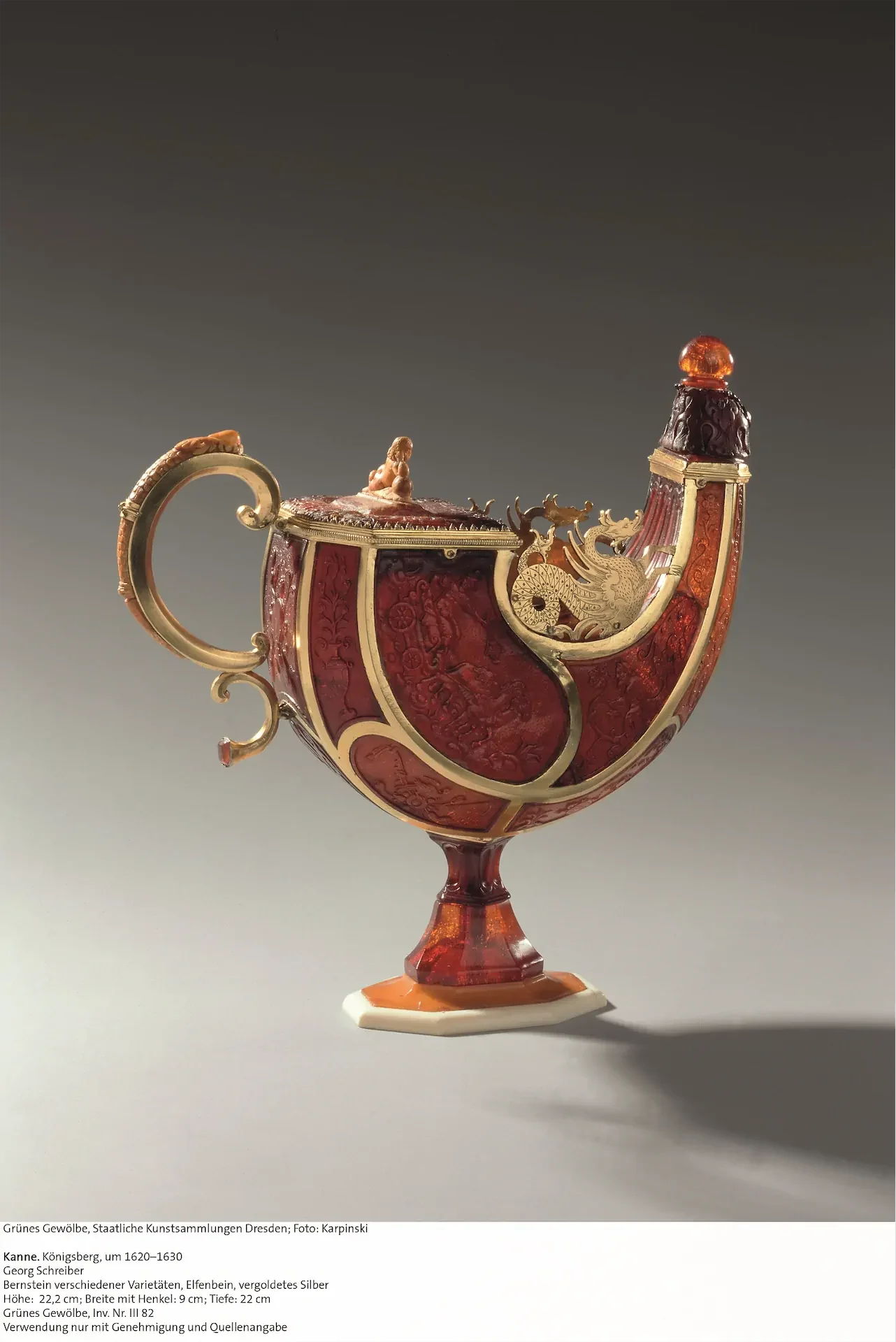 Georg Schreiber (†1643), jeden (z dwóch) założycieli gildii w Królewcu w 1641 r., sygnował kilka swoich dzieł, podczas gdy inne zostały mu przypisane. Wśród nich jest wspaniały dzban w kształcie muszli ślimaka – w drezdeńskiej Kunstkammerze znalazł się (prawie 20 lat po śmierci Schreibera) w 1662 r. Jest to arcydzieło reprezentujące jedną z najbardziej typowych specjalności stylu królewieckiego: dzban, który nigdy nie służył do celów praktycznych, wykonany jest z bardzo cienkich półprzezroczystych segmentów z bursztynu zdobionego rzeźbieniami. Pozłacane paski srebra tworzą obramowanie, w którym osadzone są elementy bursztynowe.