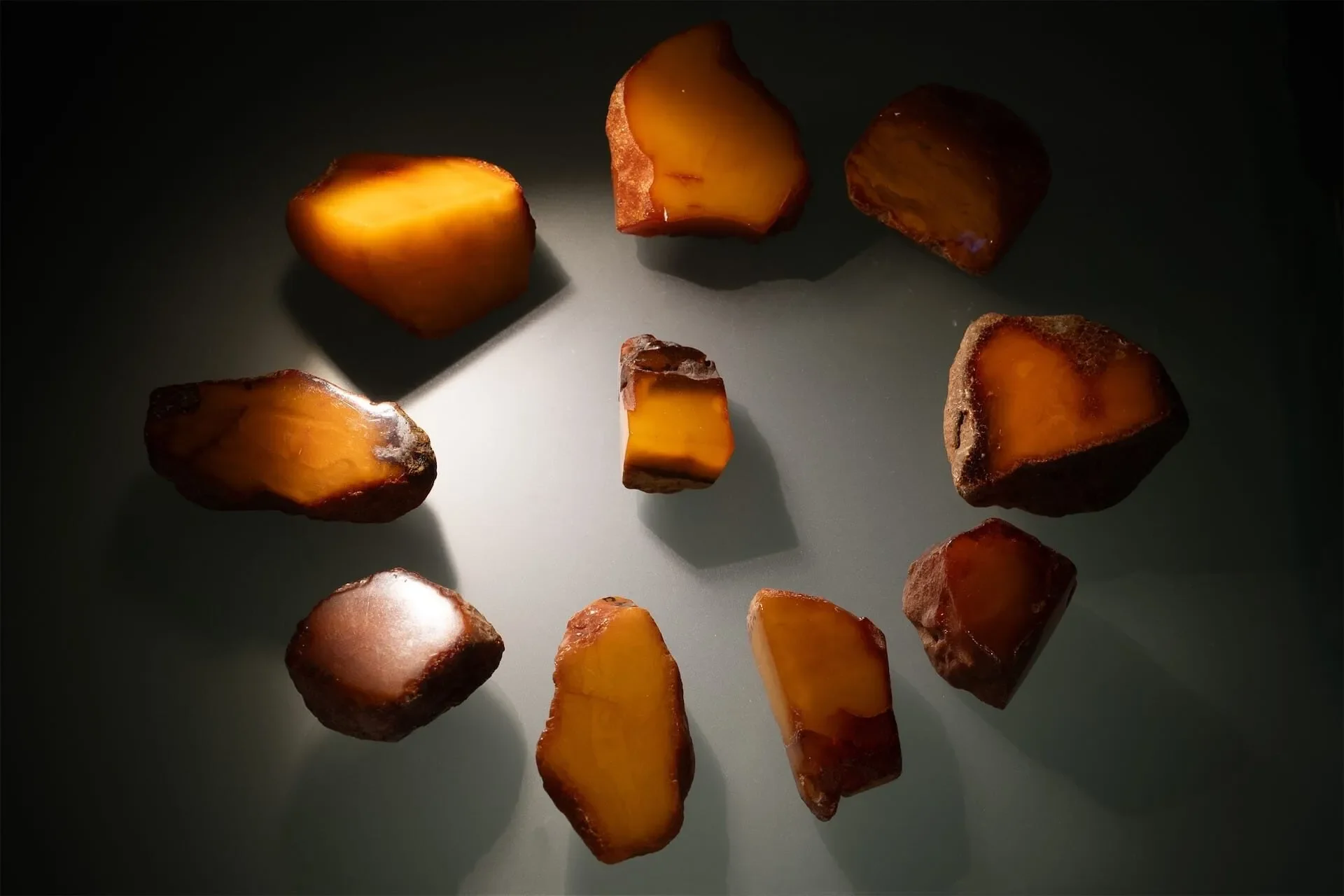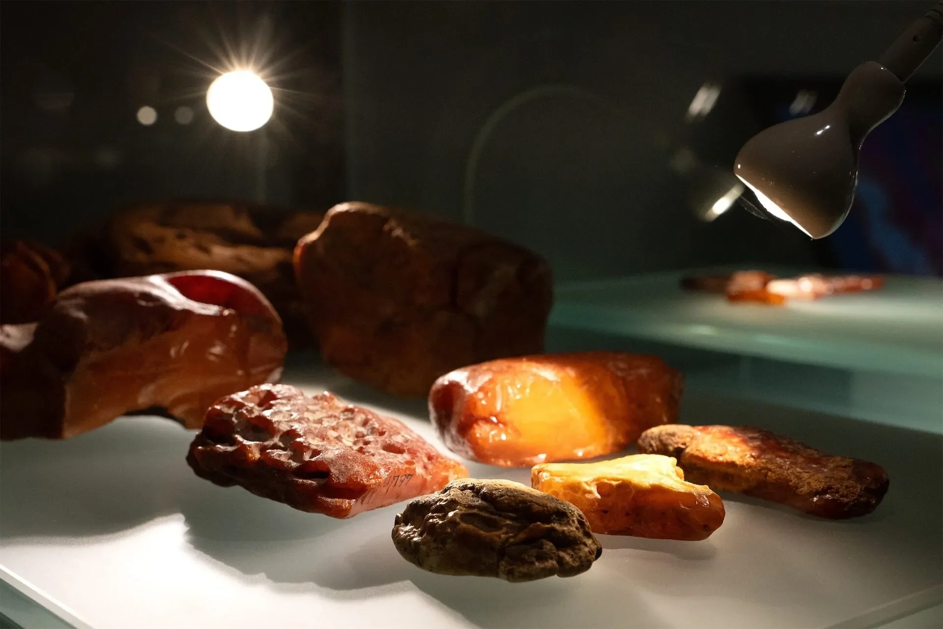 • formy naturalne i obrobione prezentujące odmiany bursztynu: pierwotne i wtórne,