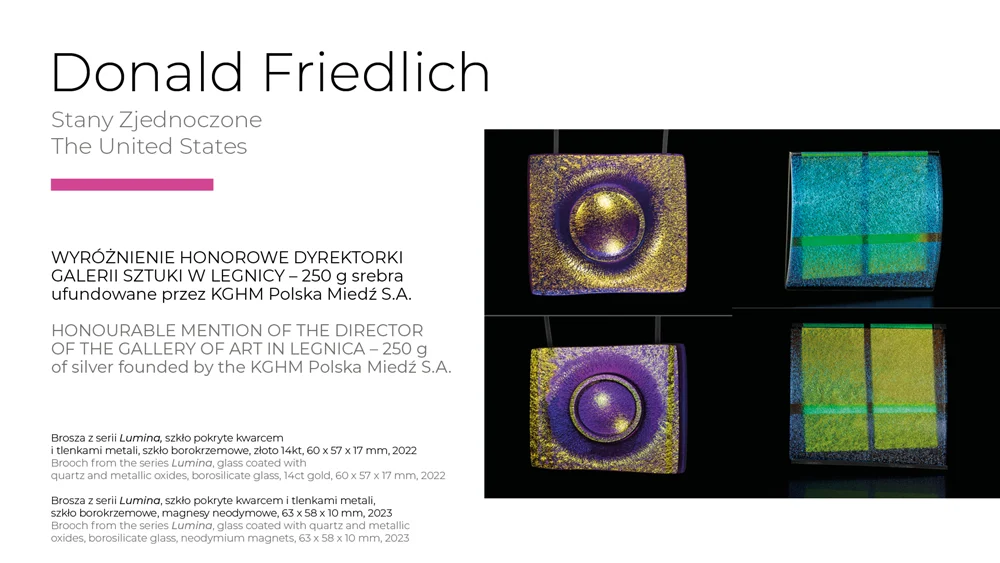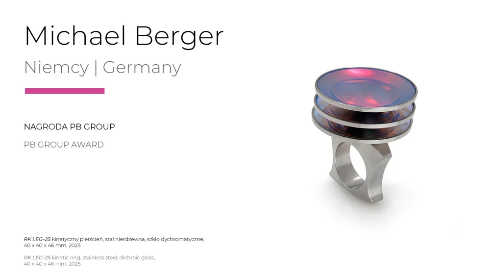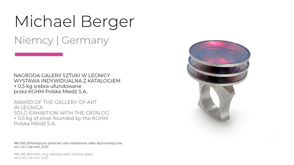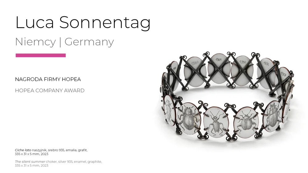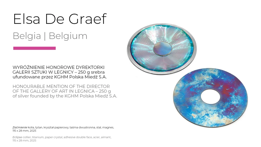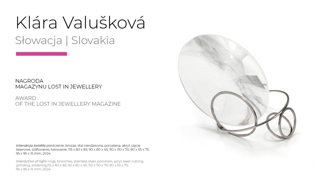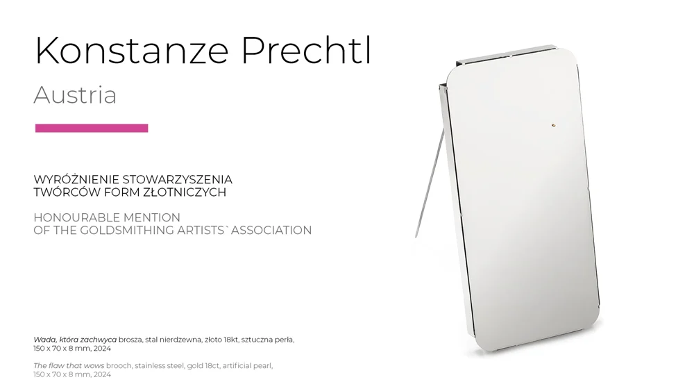 This year's level of the Legnica exhibition confirms its importance as the leading event in the area of artistic jewellery in Europe. This is evidenced not only by the number of works submitted, but also by the quality and stylistic and workmanship diversity of the objects qualified for the exhibition and awarded. Surely each visitor to the exhibition will find his or her own „WOW effect!” The work that won the Grand Prix - by Austrian artist Konstanze Prechtl - is worth a close look. It is not only a cleverly constructed object, made using innovative industrial laser cutting technology, but also a thought-provoking commentary on the interface between the real and the digital world with a consciously designed, distracting blemish, distracting us from the display through which we view the world today. It is an invitation to at least temporarily log off, concentrate and return to material reality," concluded Professor Sławomir Fijałkowski, one of the jurors of this year's competition.