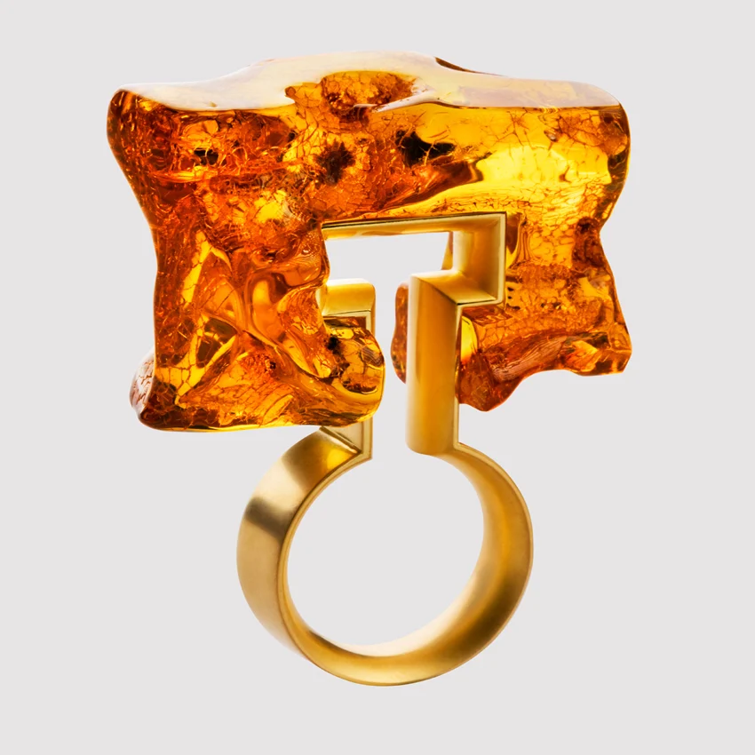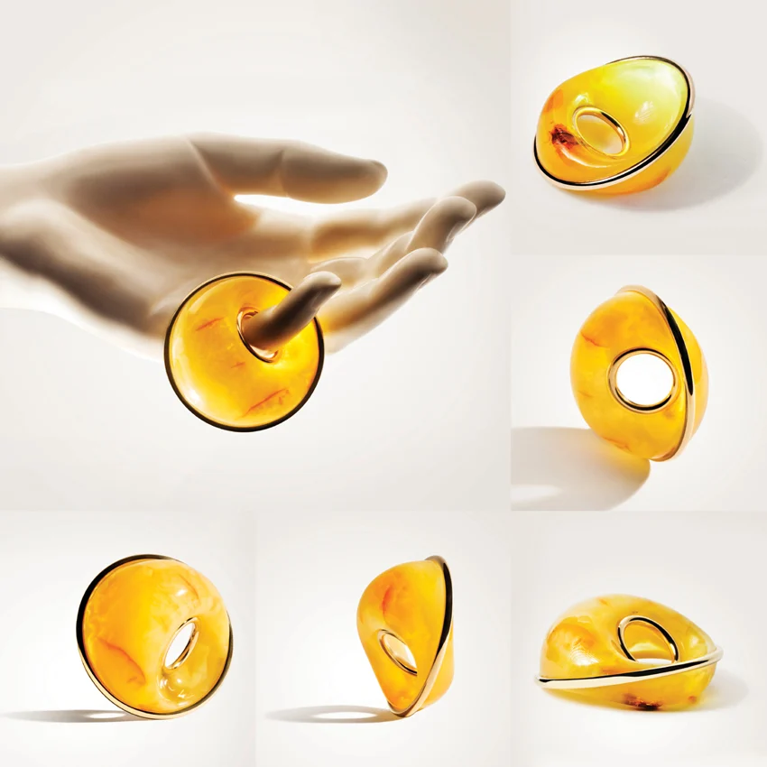 Pamiętam, jak 40 lat temu zapytałem znajomego jubilera o bursztyn, a on powiedział, że równie dobrze mogę zrobić coś ze szczoteczki do zębów. Przyrównał bursztyn do plastiku, bo tak właśnie się ten kamień wtedy kojarzył. Przez wiele lat nie był dla mnie interesujący, bo jest bardzo nietrwały – a dla mnie miało to ogromne znaczenie, ponieważ chciałem zrobić coś nietypowego. W przeciwieństwie do większości, która wykorzystywała go wyłącznie w charakterze „oczka” w broszce czy pierścionku, ja miałem pomysł na wykorzystanie go w strukturze przedmiotu. Zacząłem robić przedmioty, w których bursztyn był elementem takim samym jak metal – przestał być w ten sposób ozdobą, zaczął tworzyć przedmiot. Co więcej, jak już używałem bursztynu, to musiał on grać pierwsze skrzypce. Tak powstała pierwsza kolekcja surowych bryłek, które tworzyły konstrukcję przedmiotu. I tak pozostało do dziś. Bursztyn to wdzięczny kamień. I ma wprost niewiarygodny walor, jakim jest jego wiek. Na mnie te 40 mln lat robi ogromne mnie wrażenie. A czasem wręcz paraliżuje, zwłaszcza kiedy trzeba podjąć decyzję o nieodwracalnej ingerencji w bryłę wyjątkowej urody – bo nigdy nie mam pewności, czy przedmiot, który wymyślam, będzie wystarczająco atrakcyjny, by to działanie uzasadnić. Takich pięknych, naturalnych bryłek, które czekają na oprawę od lat, mam kilka – i ciągle nie mam pewności, czy mój pomysł jest wystarczająco dobry. Wystarczająco oznacza dla mnie nieomal stuprocentową pewność – dopiero wtedy mam odwagę je pociąć.