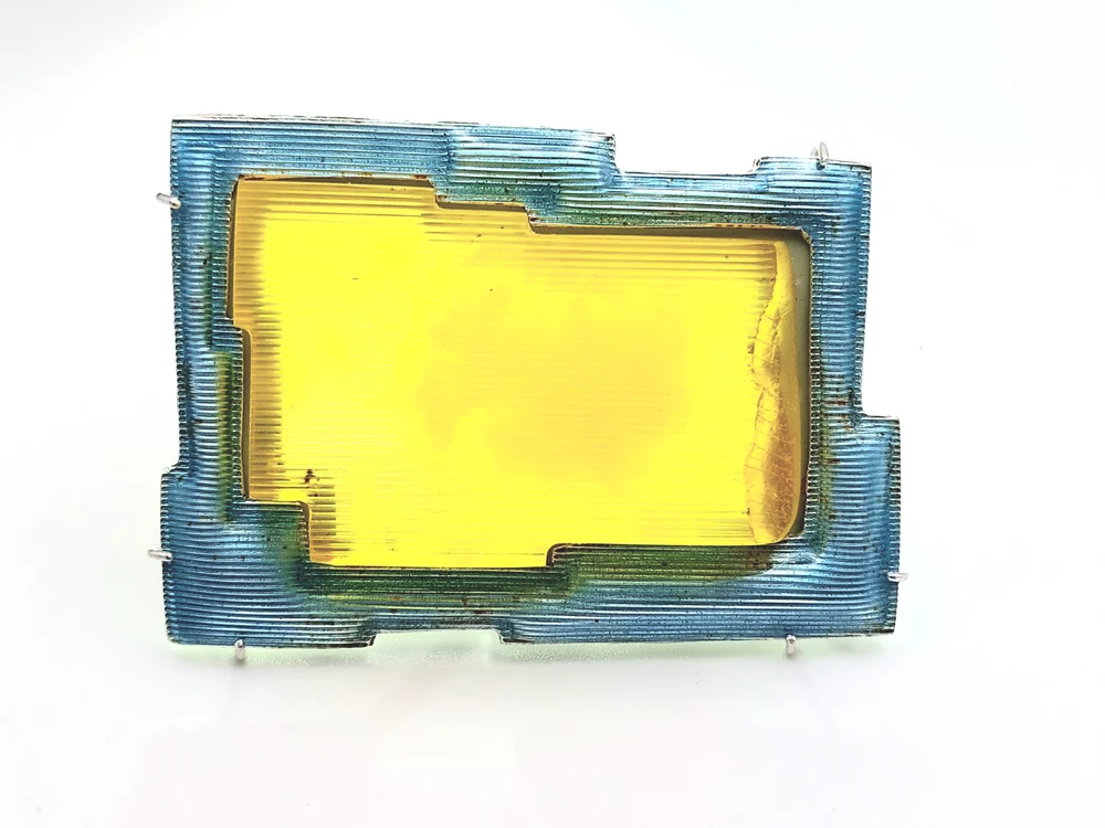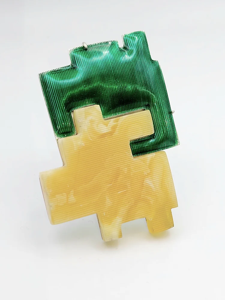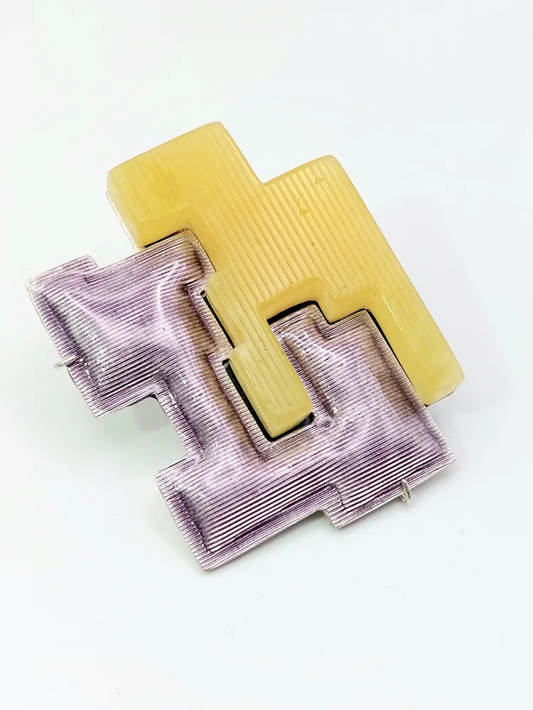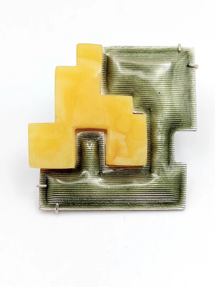 W formach przypominających puzzle połączyłam bursztyn i emaliowane srebro, zderzając przeszłość z teraźniejszością i budując między nimi dialog. Praca z kolorem pozwoliła wydobyć piękno żółtych odcieni bursztynu i podkreślić piękno każdego kawałka w indywidualny sposób. Lubię łączyć różne materiały i kreować w ten sposób nowe byty – rozpoznawalne w swojej prostocie archetypy rzeczy, niezależnie od czasów, w których powstały.