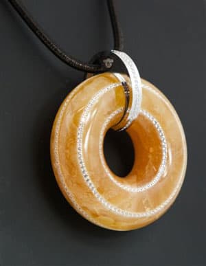 Z kołem jako wcieleniem uniwersalności praca ta uosabia prostotę formy. Projekt jest ponadczasowy i może go nosić każdy, bez względu na wiek. Jest też wysoce wyrafinowany i bardzo atrakcyjny dla świata mody. Perfekcyjnie wykonane osadzenie kamieni w bursztynie bez dodatkowych elementów świadczy o wysokim kunszcie jubilerskim. Dodatkowo uznanie budzi pomysł na rozwiązanie konstrukcyjne zawieszenia.