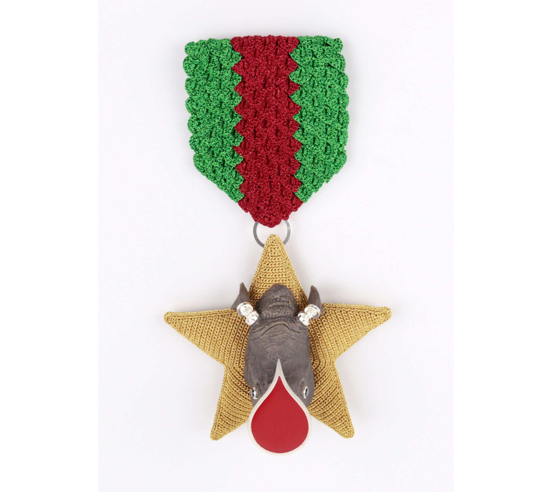 Felieke van der Leest (Holandia) – Honorowy Medal za zabicie ostatniego nosorożca brosza, tkanina, plastik, zwierzę, srebro, czarny diament, żywica syntetyczna, 2018
