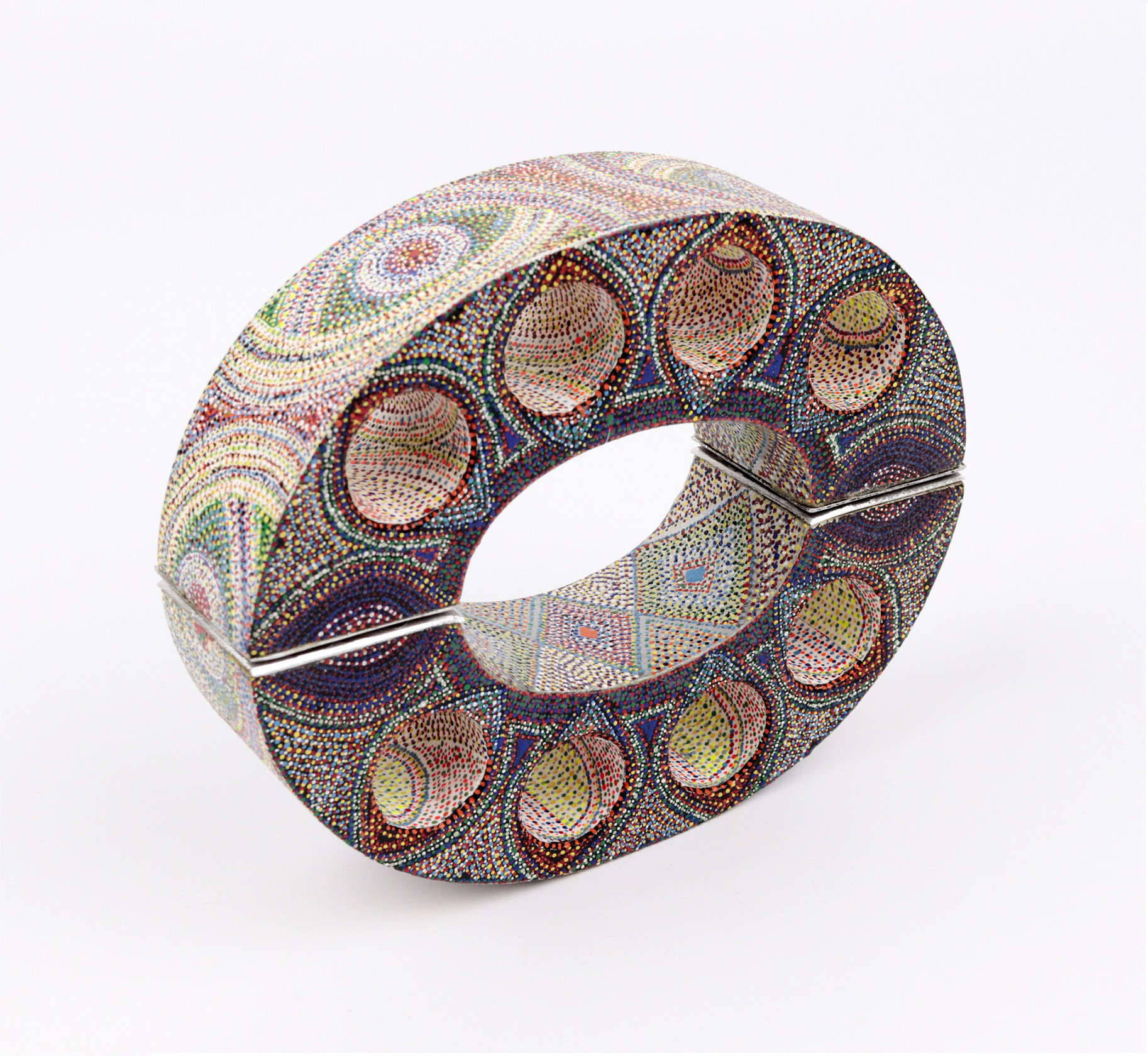 Sham Patwardhan – Joshi (Niemcy) - Za pomocą okularów zmienia się własną osobowość? bransoleta, drewno, papier, farba emaliowa, aluminium, magnesy, kropki malowane igłą, 2018