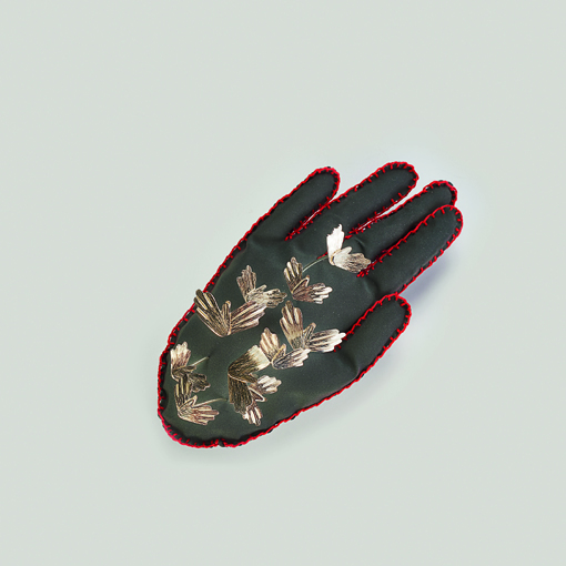 Martina Obid Mlakar (Słowenia) - Poduszka dotyków, brosza: tkanina odblaskowa, czerwona nitka, srebro 925