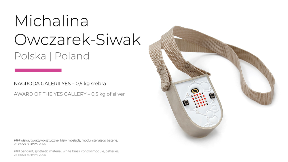 Tegoroczny poziom legnickiej wystawy potwierdza jej znaczenie jako wiodącego wydarzenia w obszarze biżuterii artystycznej w Europie. Świadczy o tym nie tylko liczba nadesłanych prac, ale także jakość oraz stylistyczna i wykonawcza różnorodność zakwalifikowanych do wystawy oraz nagrodzonych obiektów. Z pewnością każdy z odwiedzających wystawę odszuka na niej swój własny „efekt WOW!” Warto uważnie przyjrzeć się pracy, która otrzymała Grand Prix – autorstwa austriackiej artystki Konstanze Prechtl. To nie tylko mądrze skonstruowany przedmiot, wykonany przy pomocy innowacyjnej, przemysłowej technologii cięcia laserowego, ale także dający do myślenia komentarz dotyczący styku świata rzeczywistego i cyfrowego ze świadomie zaprojektowaną, rozpraszającą skazą, odciągającą uwagę od wyświetlacza, przez który oglądamy dzisiaj świat. To zaproszenie do choćby chwilowego wylogowania się, koncentracji i powrotu do materialnej rzeczywistości – podsumował prof. Sławomir Fijałkowski, jeden z jurorów tegorocznego konkursu.