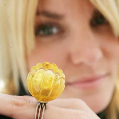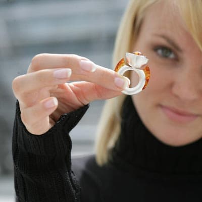 Pierścionek Johannesa Hasselmanna: Dużych rozmiarów bursztyn, częściowo nieobrobiony, zamknięty w niespotykanej formie. Mimo oryginalnego wzornictwa pierścionek sprawia wrażenie raczej klasycznego, a swym wyglądem przypomina małą rzeźbę.