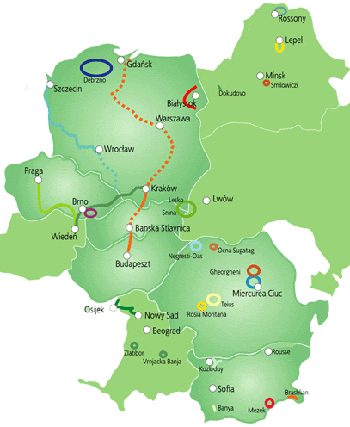 Ten międzynarodowy szlak rowerowy prowadzący przez Węgry, Słowację i Polskę będzie kończył się w Gdańsku. Wiedzie on śladami starożytnego szlaku, którym transportowano bursztyn znad Morza Bałtyckiego nad Adriatyk. Pierwsi trasę tą przebyli Celtowie, ale rozkwit szlaku miał miejsce w czasach Cesarstwa Rzymskiego. Dzisiaj, podróżując Bursztynowym Szlakiem, można podziwiać znane historyczne miasta i wiele obiektów znajdujących się na Liście Światowego Dziedzictwa UNESCO (m.in. Budapeszt, Banska Stiavnica, Kraków) oraz malownicze tereny wiejskie o wysokich walorach przyrodniczych i kulturowych. Bursztynowy szlak rowerowy „Greenways” zaczyna się na Węgrzech, prowadząc przez doliny Dunaju i rzeki Ipel, gdzie na uwagę zasługują zabytkowe miasta Szentendre, Vac i Nagymaros. Dalej trasa prowadzi przez zróżnicowany krajobraz na pograniczu węgiersko-słowackim z tradycyjnym budownictwem z cegły i charakterystycznymi, wielkimi bramami strzegącymi kolorowych, obrośniętych winoroślą domków. Wreszcie szlak dociera do tradycyjnych wsi karpackich o drewnianej zabudowie, jak Podbiel, Kvacany, Zubrzyca Wielka.Szlak w województwie kujawsko-pomorskim