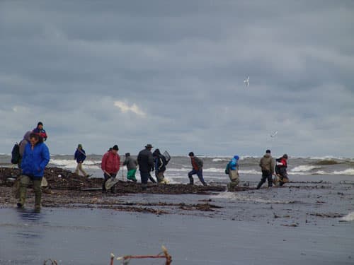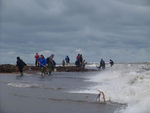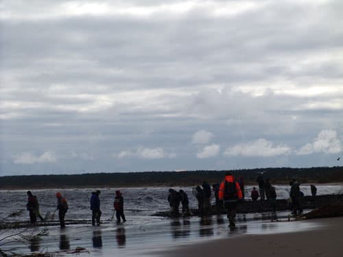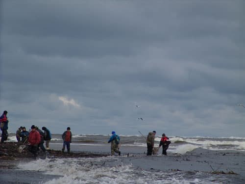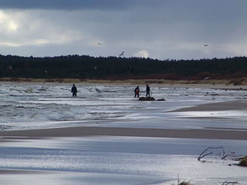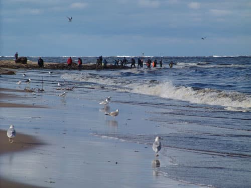 Bursztyniarze wyczekują wietrznej, wręcz sztormowej pogody. W okresie burz plaża zaczyna żyć własnym życiem. Sztormowa pogoda przynosi bursztyn na brzegi morskie, przyciągając tym poławiaczy. Co kilkanaście minut wzdłuż brzegu morskiego przejeżdża bursztyniarz na motorze, quadzie, rowerze lub pieszo wędrując w poszukiwaniu miejsca, gdzie będzie wyrzucać śmiecie (patyki, wodorosty itp.). A pomiędzy nimi bursztyn.