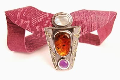 Również w tej nowej linii główną rolę grają kolorowe kamienie naturalne, choć tu występują w bardziej pastelowych odcieniach. Baśniowe zestawienia tworzą ametyst, kamień księżycowy, labradoryt, opal, kwarc różowy i turkus. Budują one barwne tło dla różnych odmian naturalnego bursztynu bałtyckiego – od słomkowych, przez mleczne i miodowe, po jego najciekawsze formy pełne tajemniczych inkluzji i niesamowitych odcieni. Romantyczno - wiosenny charakter tworzonych przez nie kompozycji podkreślają srebrne oprawy ze złoconymi elementami zdobniczymi, dodatkowo akcentujące urodę bursztynu. I choć oprawy są nieco bardziej masywne, nie zaburzają efektu delikatności i ulotności. Bliskość z naturą podkreślają również naturalne skóry o soczystych barwach – „wkradły” się one do obydwu linii, dodatkowo wzmacniając efekt kolorystyczny.