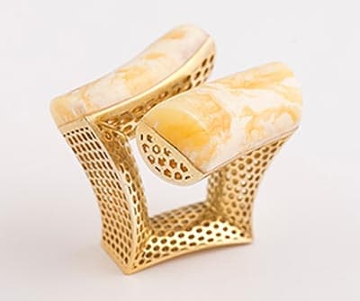 Pierścień Beijing zaprojektowany przez Mirona Kutarbę i wykonany w firmie A2 Studio Biżuterii to laureat Konkursu na Najatrakcyjniejszą Biżuterię z Bursztynem prezentowaną na targach Ambermart 2017.