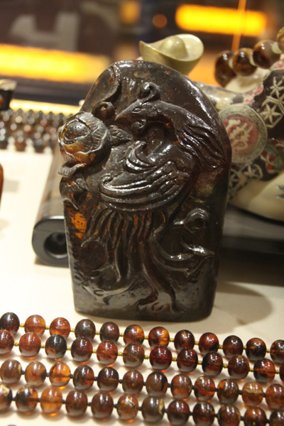 Przede wszystkim Chińczycy zupełnie inaczej rozumieją słowo festiwal – używa się go w odniesieniu do wydarzeń o bardzo poważnej randze. Organizatorem był Instytut Bursztynu z Fushun oraz władze miasta Fushun i prowincji Liaoning; Instytut jest wprawdzie prywatny, ale ma pełne wsparcie władz miejskich i państwowych. Ważnym wydarzeniem Festiwalu było otwarcie Amber Trade Center for the Amber Business. Jest to nowopowstały budynek, w którym zorganizowano coś w rodzaju targów bursztynu, gdzie wystawcami byli przede wszystkim właściciele zakładów wytwórczych, wcześniej zlokalizowanych w sąsiedztwie kopalni. Przyznam szczerze, że nie wiem, czy to będzie stała prezentacja, czy zorganizowano ją tylko na czas konferencji, ale sądząc z zapowiedzi, będzie to chyba stałe miejsce obrotu bursztynem i wyrobami z bursztynu. Tak czy inaczej, była absolutnie fascynująca. Na stoiskach dominowały rzeźby i biżuteria z bursztynu z Fushun oraz gagatu: bazujące na tradycji, a przy tym bardzo ekskluzywne, a więc i horrendalnie drogie. Zwłaszcza te wykonane z bursztynu przezroczystego i z naturalnym odcieniem wiśniowym czy koniakowym. Za taką bransoletkę trzeba było zapłacić nawet 20 tys. juanów, czyli ok. 10 tys. zł. Nie sama wartość surowca jest tu decydująca, tylko to, co zostanie z niego wykonane i kto jest wykonawcą. Ceny prac kilku uznanych lokalnych rzeźbiarzy są wręcz kosmiczne, ale nabywców nie brakuje.