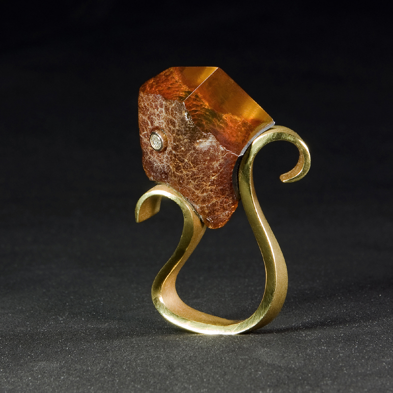 Bardzo rzadko wykorzystuję bursztyn i zazwyczaj pojawia się on w pracach eksperymentalnych, które wykonuję na konkursy i wystawy. W ostatnim czasie sporo się dzieje wokół bursztynu, więc miałem możliwość pokazania moich prac na prestiżowych wystawach, m.in. „Bursztyn bałtycki. Tradycja i innowacja” oraz „Bursztyn bałtycki. Dziedzictwo i nowoczesność”. Lubię bursztyn, ponieważ jest wdzięcznym kamieniem, pięknym w każdej formie – surowy, pokryty skórą kory czy błyszczący powierzchnią szlifu. Jest wspaniale otwarty na twórczą interpretację – odrobina szacunku wystarczy, aby wzbogacił każdy przedmiot. Cenię go za mnogość odmian barwnych i przejrzystość – to powoduje, że można go wykorzystać w różnych formach biżuteryjnych.