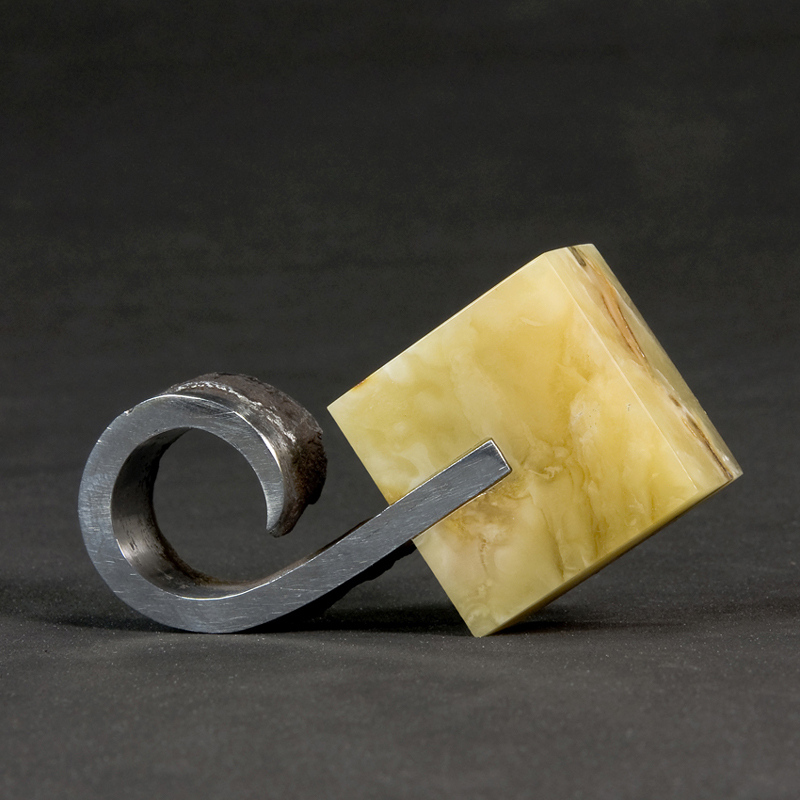 Wykorzystuję efekt wizualny obu tych powierzchni, zachowując naturalną strukturę bursztynu istniejącego w przyrodzie ponad 40 mln lat, i metalu, ukształtowanego niegdyś przez kowala a potem pokrytego rdzą przez naturę. Na obu tych materiach swoje artystyczne piętno odcisnął czas i przez to indywidualnie – jak i w zestawieniu w biżuterii – stają się one dla mnie jeszcze bardziej fascynujące. Pokazuję je z różnej perspektywy, np. odsłaniając wnętrze bursztynu i wewnętrzną strukturę metalu. Początkowo wykorzystywałem w swoich pracach elementy stalowe w zastanej formie, a potem włączyła mi się nieodłączna potrzeba skomplikowania pracy, więc zacząłem eksperymentować z metalem, poszukując autorskich metod w uzyskaniu naturalnej struktury oraz kontrolowanego efektu naturalnej rdzy.