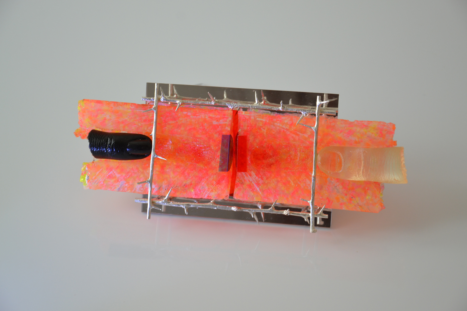Każdy materiał kryje w sobie jakiś przekaz. Niesie go tradycja, kolor, jego cechy fizyczne. Kiedyś twierdziłem, że o nowych zagadnieniach lepiej mówić poprzez nowe materiały, gdyż nie są tak obciążone znaczeniami. Wszystko wraca i nagle się okazuje, że te stare komunikaty nakładają się na nowe i powstaje wielowarstwowy przekaz. Ostatnio zauważyłem, że to czasami duża zaleta w realizacjach, i już nie wystrzegam się pewnych materiałów czy kolorów. Przed wernisażem w Muzeum Biżuterii Współczesnej dwóch studentów historii sztuki odnalazło w tych broszach – poprzez ciernie i czarny kolor – odniesienia do XIX-wiecznej biżuterii patriotycznej. Zawsze wszystkie części realizacji przygotowałem do konkretnego projektu. Duża część użytych w prezentowanych w broszach elementów to „pozostałości” z niewykorzystanych części ze starych prac – więc jest też podejście eko.