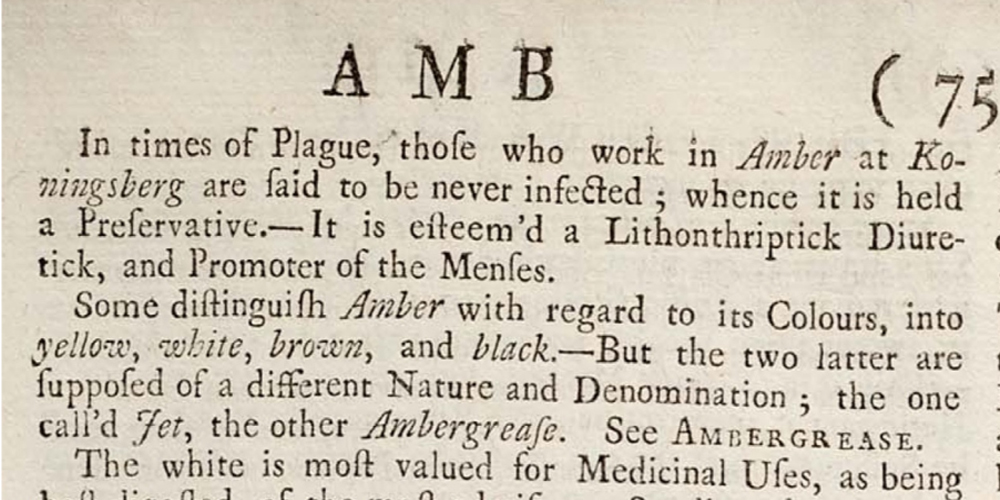 Cyclopaedia: or, An Universal Dictionary of Arts and Sciences E.Chambersa, 1728; wpis dotyczący bursztynu i epidemii dżumy