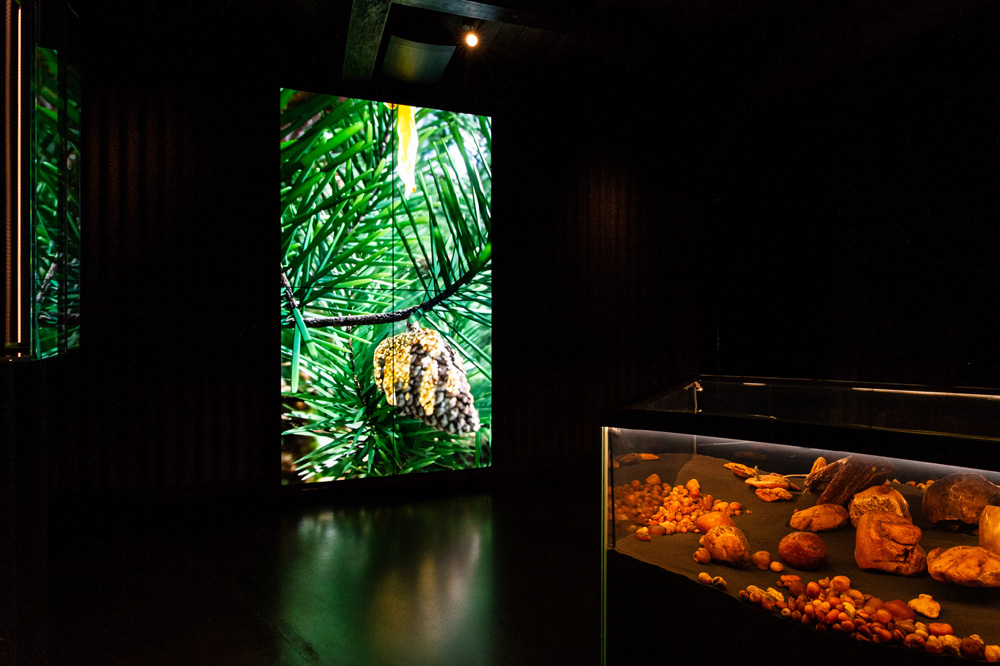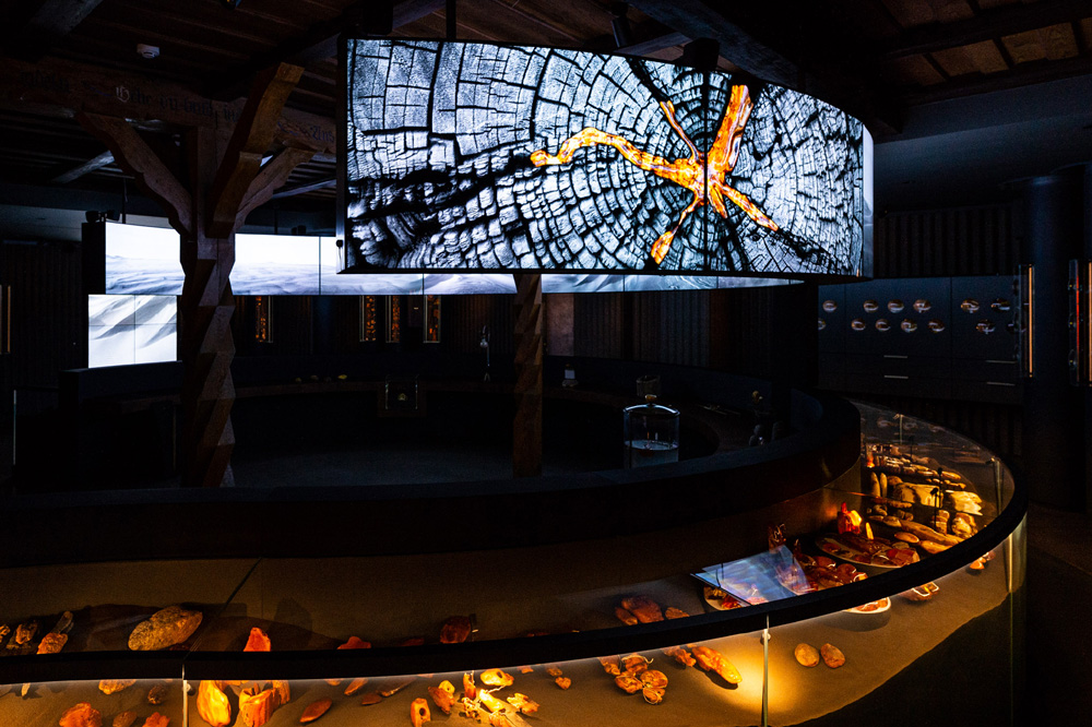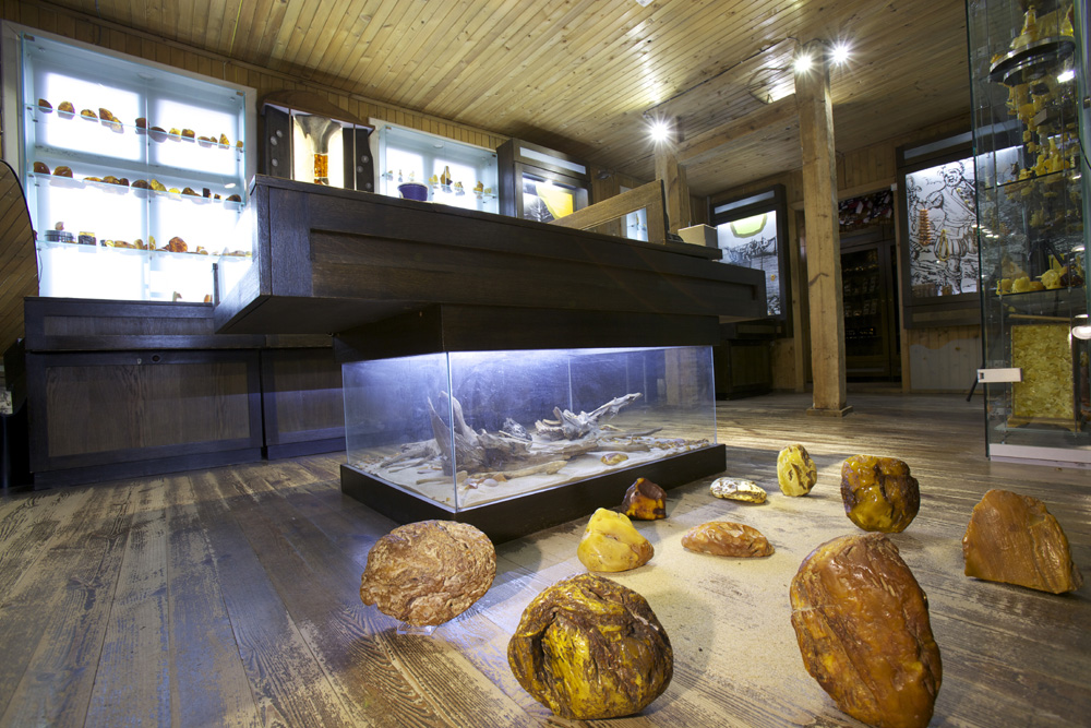 W tym muzeum koncentrujemy się przede wszystkim na prezentacji bursztynu od strony artystycznej. Nie zabraknie oczywiście także wiedzy na temat samego kamienia, która jest przekazywana w sposób interaktywny. Motywem przewodnim w muzeum są las bursztynowy i bursztynowa rzeka, której nurtem publiczność płynie od jej źródła w naturze ku ujściu w świecie współczesnej kultury. Historia bursztynu jest opowiadana przez wyjątkowej urody bryły oraz sztukę bursztynniczą i została wzbogacona wirtualnymi opowieściami o jego powstaniu, bogactwie form i barw, inkluzjach, sposobach pozyskiwania oraz jego roli w kulturze regionu. W filmie o bursztynowym lesie jest prezentowana fauna i flora sprzed ponad 40 mln lat. Krótka animacja przypomina miejscową legendę o królowej Juracie zakochanej w miejscowym rybaku Kastytysie – rozgniewany bóg Perkun zniszczył jej bursztynowy pałac, którego szczątki do dziś Morze Bałtyckie wyrzuca na brzeg. W niestandardowy sposób – bo za pośrednictwem artystycznych środków wyrazu – przybliżamy informacje o najważniejszych cechach fizycznych oraz leczniczych właściwościach bursztynu bałtyckiego. Na ekranach dotykowych można przeglądać bursztynową encyklopedię – uwadze polecamy m.in. te karty, na których prezentowane są inne niż bałtycki rodzaje bursztynu występujące w różnych zakątkach świata. Na piętrze prezentowane są dzieła litewskich i zagranicznych twórców. Tutaj też można „zwiedzić” Bursztynową Komnatę.