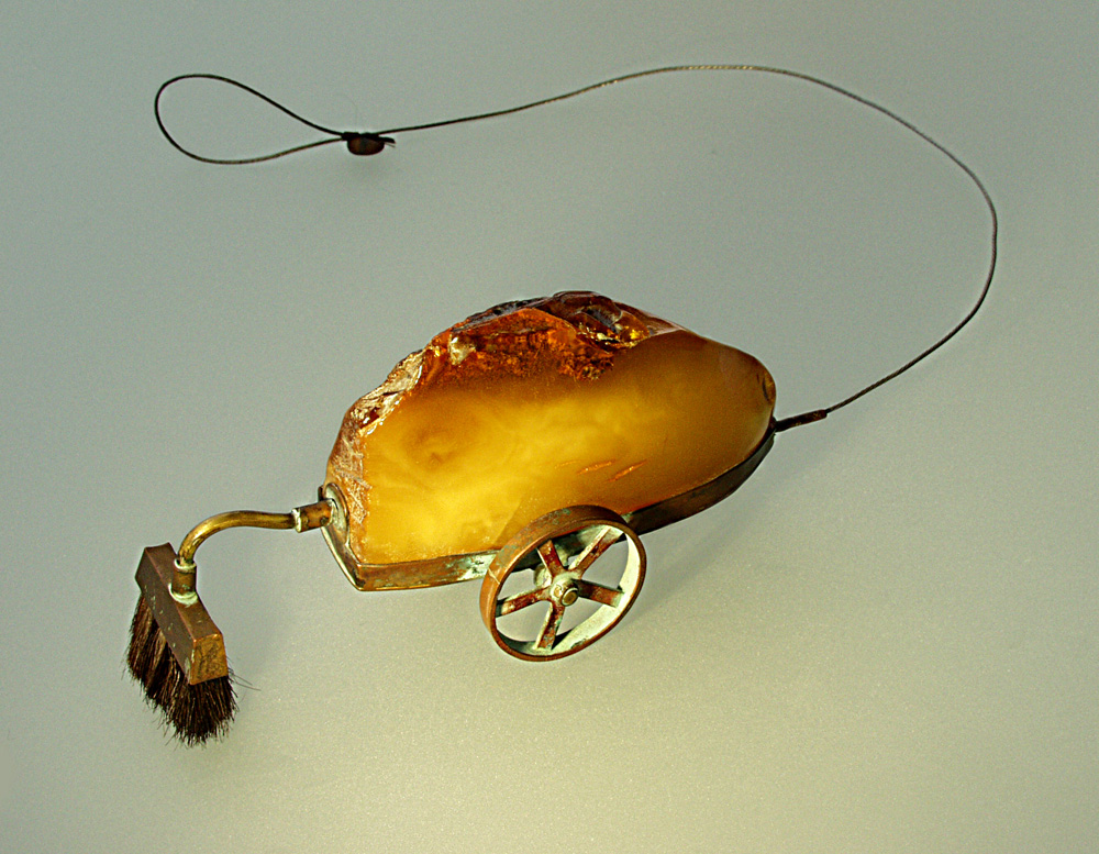 I Polacy, i Litwini mają bardzo bogate tradycje obróbki bursztynu bałtyckiego. I jedni, i drudzy znani są na całym świecie dzięki nowoczesnemu i kreatywnemu podejściu do tego kamienia, co bardzo dobrze widać na licznych przykładach współczesnej sztuki bursztynniczej. W Litwie ma ona tak wiele różnych twarzy, że trudno mi się nawet pokusić o znalezienie dla artystów i ich dzieł wspólnego mianownika, który definiowałoby litewską scenę złotniczą. Każdego twórcę cenię za jego indywidualne podejście do bursztynu. W „starej” generacji warto zwrócić uwagę na Birutė Stulgaitė – jedną z najbardziej znanych litewskich jubilerek. Jej biżuteria to minimalizm w czystej postaci i ogromna subtelność w podejściu do materiału. W bursztynie ceni przede wszystkim jego naturalną formę, więc ingeruje w nią w minimalnym stopniu. Bursztyn, jak twierdzi, sam jej podpowiada, jak chce być oprawiony – zazwyczaj łączy go z innymi materiałami organicznymi. Wysoko cenię również Sigitasa Virpilaitisa za jego postmodernistyczne podejście do bursztynu i brak ograniczeń twórczych. Przejawia się to w zaskakujących połączeniach, gdzie obok siebie występują materiały cenne i te uchodzące za pospolite, gdzie zacierają się granice między tym, co subtelne, a tym, co wulgarne. W biżuterii Virpilaitisa bursztyn jest np. karmelem, z którego twórca niczym cukiernik wypieka różne formy. Natomiast jeśli chodzi o artystów młodej generacji, to warto wymienić Eglė Čėjauskaitė-Gintalė, która tworzy ekskluzywną, daleką od tradycyjnych kanonów biżuterię, oraz Nerijusa Erminasa, który poprzez swoje zdekonstruowane obiekty wzorowane na przedmiotach codziennego użytku zmusza odbiorcę do zastanowienia się nad ich użytkowością i przekracza granicę między rzeczywistością a fikcją.