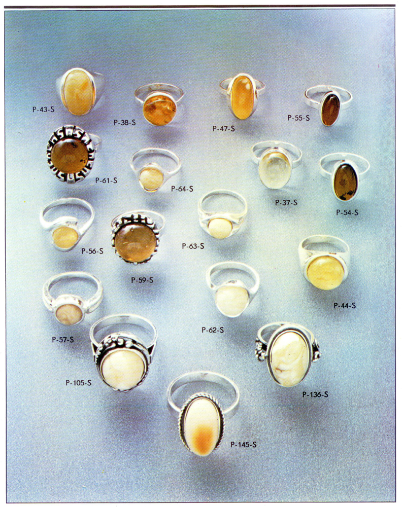 Pierścionki srebrne z bursztynami – karta folderu reklamowego spółdzielni Bursztyny (d. WWB); ok. 1990