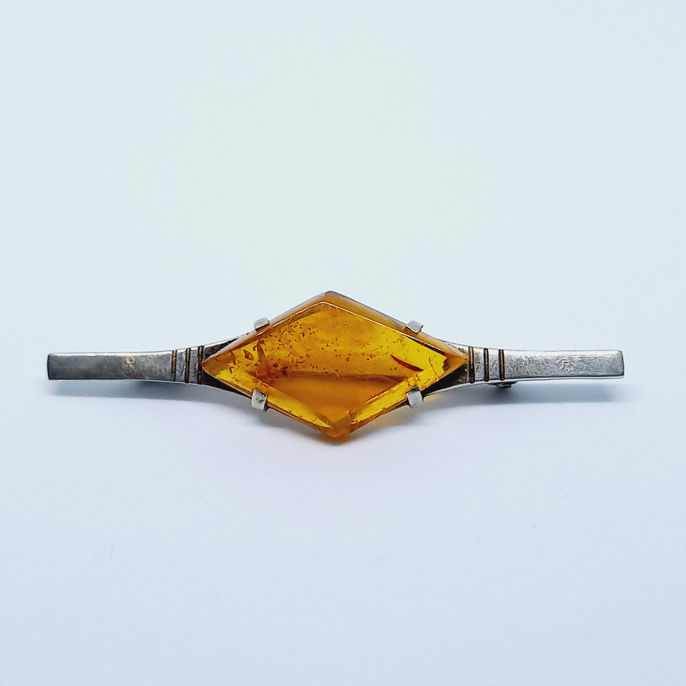 Srebrna broszka „Strzałka” z bursztynem, Wytwórnia Wyrobów Bursztynowych (?), lata 50. XX w. Kolekcja prywatna