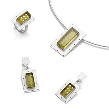 Bursztyn osadzony w srebrnych oprawach jest naturalnie przezroczysty w kolorze cytrynowym. Powierzchnie opraw zaskakują różnej wielkości perforacjami, co nadaje im ciekawego efektu lekkości i nowoczesności. Poprzez przezroczyste kamienie widać ażurowy spód oprawek.