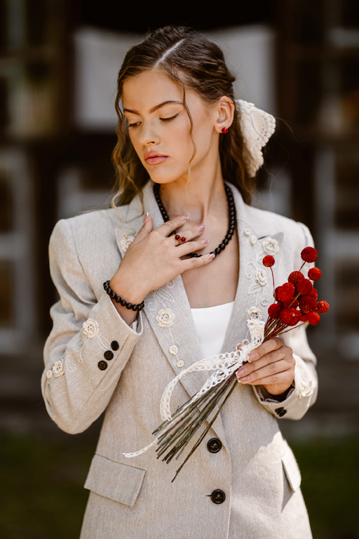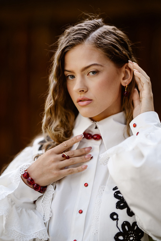 Kiedy zobaczyłam czerwone bursztynowe korale, przepadłam. Od razu wiedziałam, że będą idealne do kolekcji inspirowanej mazowieckim folklorem. Bursztyn kojarzymy z Pomorzem, ale przecież był znajdowany i wykorzystywany do tworzenia biżuterii w całej Polsce – także na Mazowszu – wyjaśniła projektantka.