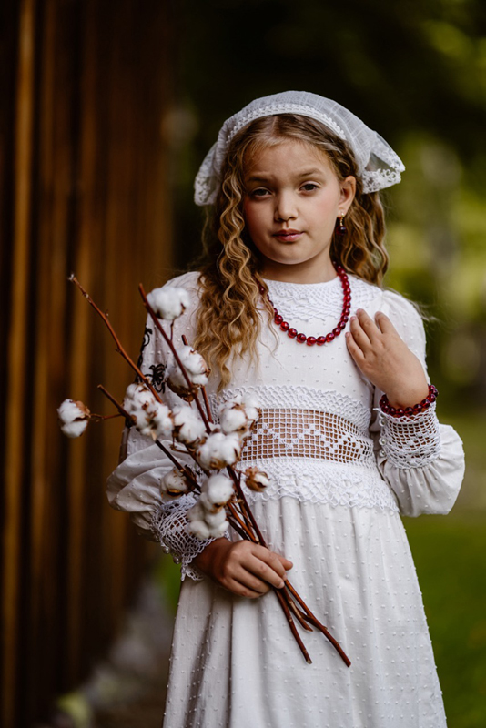 Projektantka sięgnęła po lniane tkaniny z Muzeum Lnu w Żyrardowie, utkane na zabytkowych krosnach, dzięki czemu kolekcja zyskała autentyczność i niemal muzealną wrażliwość na detal. Guziki powstały z krzemienia czekoladowego, a elementy z czerwonego bursztynu dodały sylwetkom szlachetności, lekkości i odrobiny magii. Folkowy charakter dopełniły wianki autorstwa Danusi z „Kwiatowych Zaklęć”.
