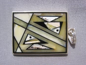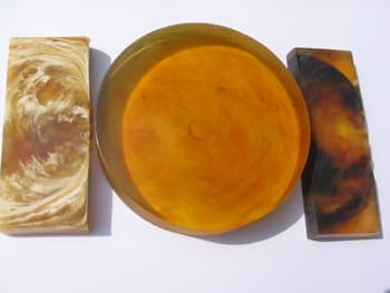 Zdjęcia: Zawieszka „Ryby” z gagatu inkrustowanego wielobarwnym bursztynem autorstwa E. Parchomienki (na górze). Przykłady odmian barwnych bursztynu prasowanego. Fot. Gabriela Gierłowska