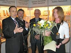 Elżbieta Sontag, znawca inkluzji w bursztynie i kierownik Muzeum Inkluzji w Bursztynie Uniwersytetu Gdańskiego, odebrała statuetkę z rąk Bursztynnika Roku 2006 Jana Wiszniewskiego. Wojciech Kalandyk, przewodniczący kapituły i Bursztynnik Roku 2004, mówiąc o laureatce, nazwał ją „człowiekiem z bursztynu” i podkreślał jej zdolność do opowiadania o bursztynie w sposób wyjątkowo przemawiający do emocji. I choć statuetka i tytuł są podziękowaniem dla niej za jej ogromny wkład w promocję bursztynu, to ona dziękowała, że mogła dołączyć do tak znamienitego grona Bursztynników Roku. „Moje marzenie o bursztynie spełniło się dzięki Państwu. Przede wszystkim dzięki profesorowi Szadziewskiemu, który pokazał mi pierwszego komara w bursztynie, i od tego wszystko się zaczęło” – mówiła. „Dzięki Ewie Rachoń i targom, na których zobaczyłam, jaki bursztyn może być. Dla mnie dziecka był on brzydki i nie lubiłam go. (...) O tym, że może być piękny, przekonałam się dopiero tutaj. I dzięki Wojtkowi Kalandykowi, który przyniósł 50 kilo bursztynu z inkluzjami do muzeum (...). I dzięki pani profesor Kosmowskiej-Ceranowicz i profesorowi Kotei – lista jest długa i mogłabym dziękować do rana.” Na zdjęciu od lewej: Wojciech Kalandyk (Bursztynnik Roku 2004), Kazimieras Mizgiris (Bursztynnik Roku 2001), Wiesław Gierłowski (Bursztynnik Stulecia) i Elżbieta Sontag (Bursztynnik Roku 2007). Fot. Michał Kosior