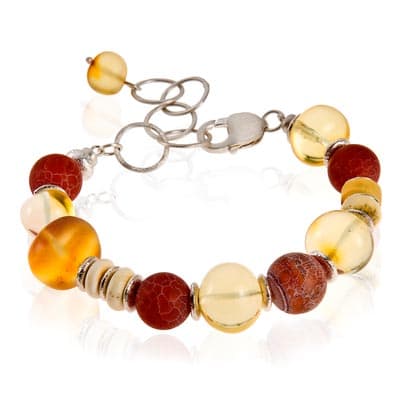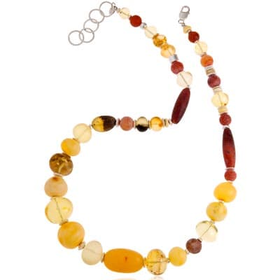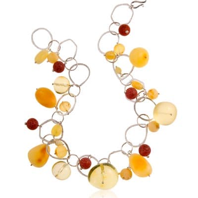 „W świecie jubilerskim bursztyn uchodzi za jeden z najbardziej subtelnych materiałów używanych w kompozycjach artystycznych. Szlachetne pochodzenie i unikalny kształt i kolor każdego z nich, zapewniają o wyjątkowym charakterze biżuterii. Kompozycja słonecznych brył bursztynu z agatami tworzy niepowtarzalne zestawienie.” – czytamy w materiałach prasowych firmy W. KRUK.