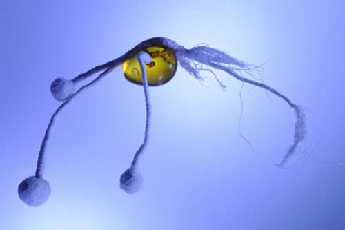 Podczas obróbki bursztynu wydziela się bardzo wyraźny zapach żywicy. Poszłam dalej tym tropem i na tej bazie skojarzeniowej powstała kolejna praca – model flakonu perfum. Wybrany przeze mnie kawałek bursztynu zawierał naturalne kanały, które można wypełnić płynem. Funkcję korka pełnią swego rodzaju „macki”; pozostałe sznurki są na stałe połączone z kamieniem. Również w przypadku tego „naturalnego” flakonu inspiracją był zapach bursztynu. Chciałam także zachować naturalny układ kanałów – w normalnych warunkach byłyby one najprawdopodobniej usunięte jako nieprzydatne.
