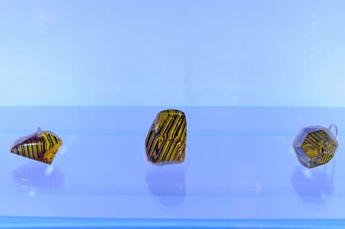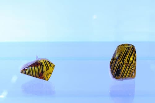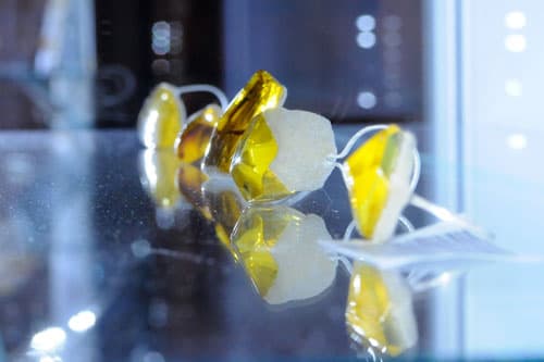 Inne moje prace przypominają kształtem komórki i powstały z plasterków bursztynu – dla mnie są one jak skupisko wysp, jak bursztynowe archipelagi. Ich brzegi są pokryte pyłem uzyskanym w wyniku szlifowania bursztynu i przywodzą na myśl piasek. Początkowo miałam zamiar połączyć ze sobą oszlifowane i dokładnie dopasowane pod względem formy elementy, by w ten sposób stworzyć jeden kamień szlachetny, jednak uznałam, że łączyłoby się to ze zbyt dużą stratą surowca w czasie jego obróbki. Patrząc z perspektywy gotowego produktu, wydaje mi się, że te bursztynowe wyspy są nawet ciekawszym pomysłem.”