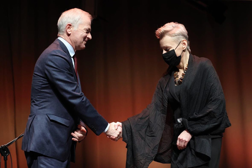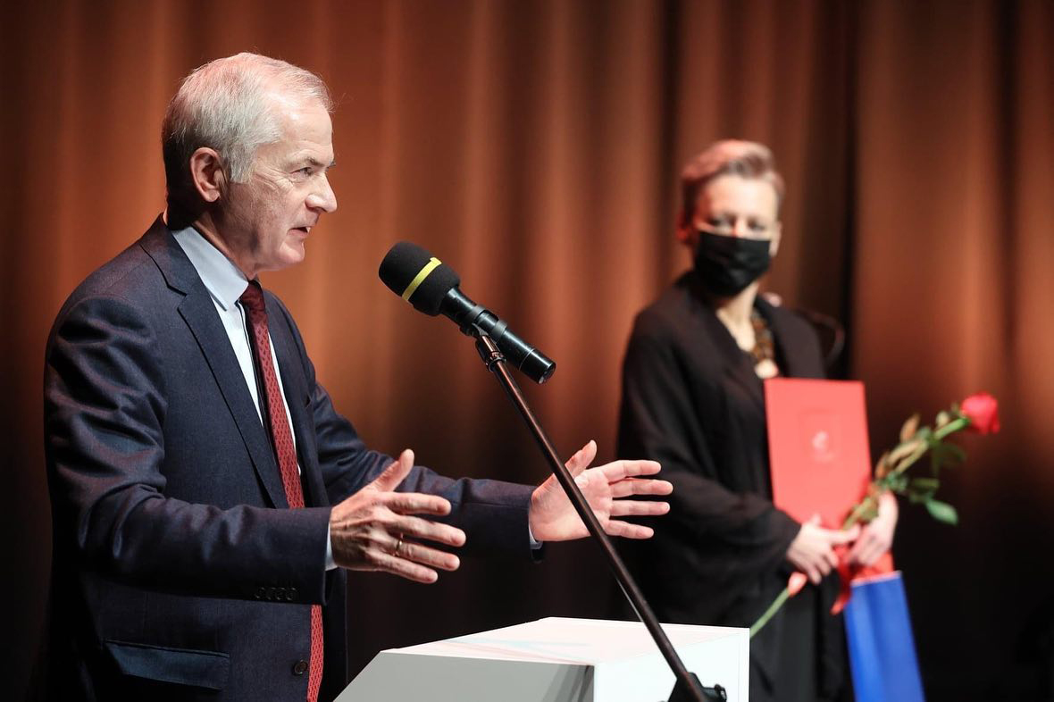 Ewa Wagner-Wysiecka odbiera Nagrodę Specjalną Marszałka Senatu z rąk senatora Sławomira Rybickiego. Fot. Grzegorz Mehring / gdansk.pl