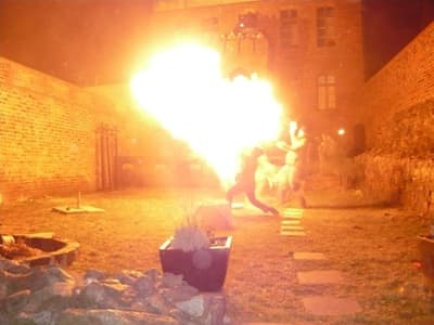 W minioną sobotę ciemności nocy przy Dworze Mieszczańskim w Toruniu zostały rozświetlone przez przecinające powietrze kule ognia – do dziesięciu metrów długości i czterech metrów średnicy. Kule ognia, tzw. fire bool, były tworzone przez miotanie pyłu bursztynowego przez źródło otwartego ognia.