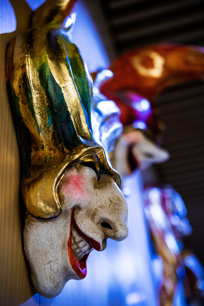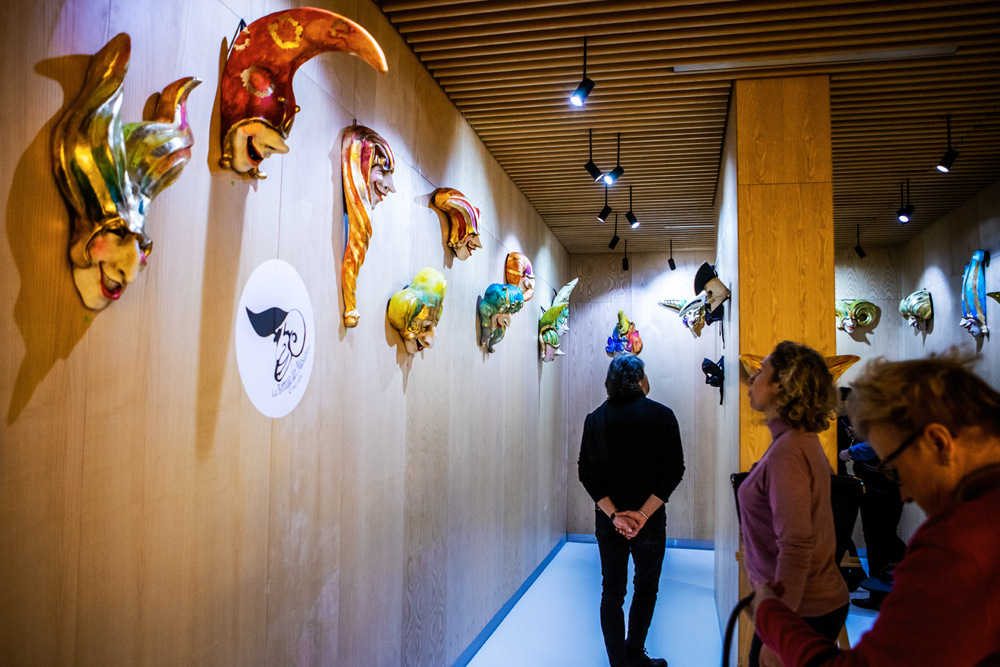 Na wystawie prezentowanych jest kilkanaście masek pochodzących z jednej z najbardziej znanych i renomowanych na świecie pracowni La Bottega dei Mascareri – tej samej, w której powstały maski m.in. do filmu „Oczy szeroko zamknięte” Stanleya Kubricka, do teledysku szkockiej grupy „The Waterboys” oraz na potrzeby Kalifornijskiego Festiwalu Szekspirowskiego. Wykonane zgodnie z duchem wielowiekowego rzemiosła nawiązują do tradycji średniowiecznych, co widać po charakterystycznych postaciach m.in. dworskich błaznów, oraz XVIII-wiecznych postaci inspirowanych komedią dell’arte. Kolekcję wyróżniają także dekoracje inspirowane rokokowym obrazami Giambattisty Tiepolo oraz oryginalne złocone elementy z motywami Księżyca i Słońca. Jedną z masek autorstwa braci Boldrinów można oglądać w Muzeum Bursztynu w Gdańsku, gdzie na wystawie stałej towarzyszą jej stroje karnawałowe projektu Joli Słomy i Mirka Trymbulaka z pokazu „La Via Dell’ Ambra”.
