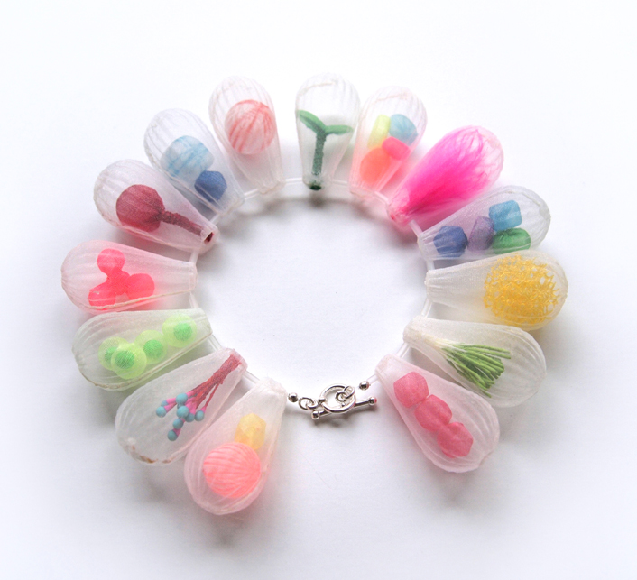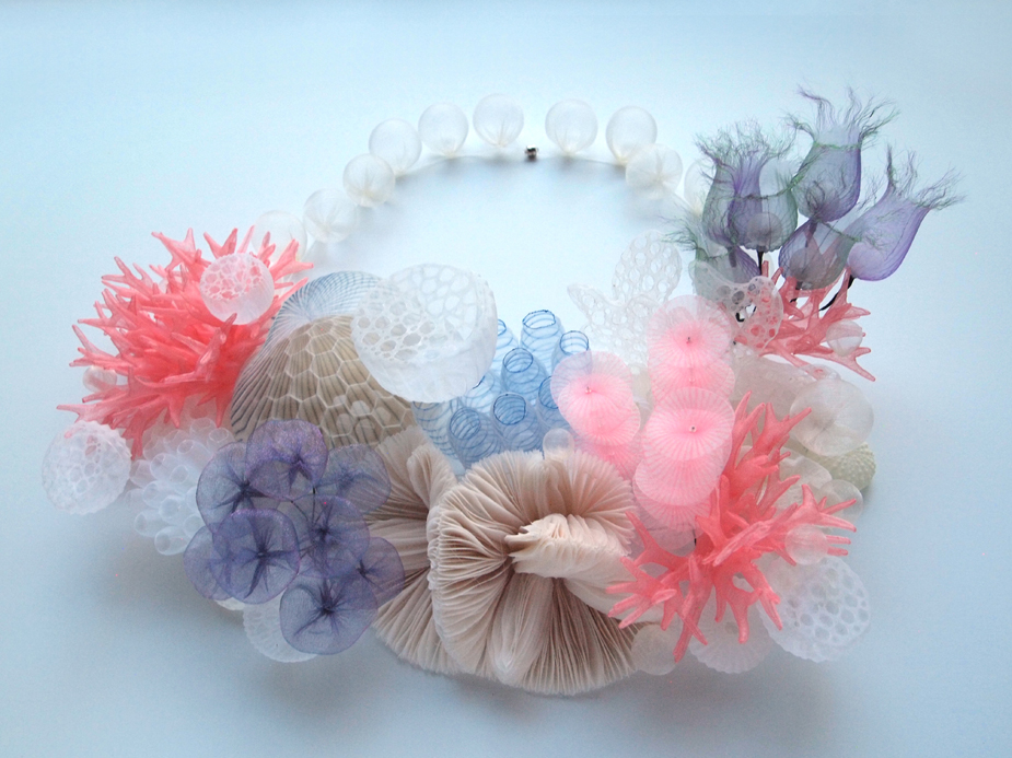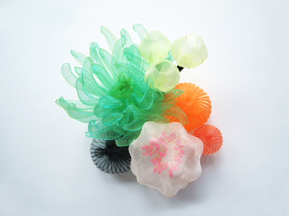 W przestrzennych obiektach biżuteryjnych artystki kryją się nowe układy, połączenia i wielowarstwowe formy – gdy w przezroczystych owalach i kręgach widzimy drugie i następne. Ruchome przez jedwabną delikatność materiału, błyszczące przez jego połyskliwość, mienią się niczym buzujące, pączkujące byty podmorskich równin lub fantastycznych ogrodów pełnych kwiatów. Delikatność gra tu ze strukturą, a geometria krągłości z rytmem powtórzeń, wypukłości i wypustków. Bąbli, kulek, owali i plis, pałeczek, kryz, frędzli, kielichów, tub, wielościanów i innych fantazyjnych brył i powierzchni o niewyobrażalnych kształtach. Pastelowe przypominają słodką i smakowitą atmosferę kinderparty, jasnobarwne lampiony, wiatraczki, baloniki, lizaki, cukierki, pianki, galaretki, bomboniery, zabawki i miękkie poduszeczki. Mocniejsze tony nawiązują do organicznych wykwitów natury, bujnych podwodnych łąk koralowych i fantazyjnych półzwierząt-półroślin, które wiodą tajemnicze, pełne niepoznanych ruchów życie na większych – tych ukrytych pod wodami, połaciach skorupy ziemskiej.