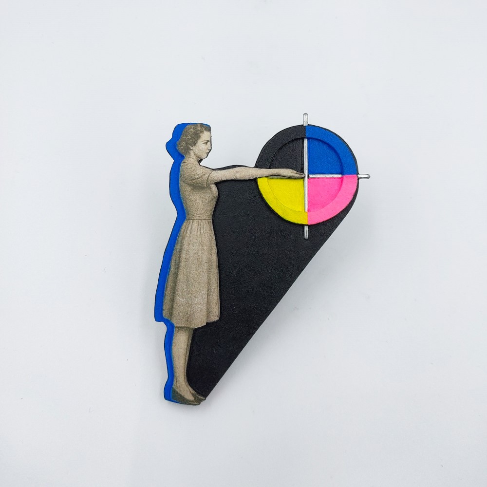 Adriana Lisowska, Adjustment brosza, sklejka, akryl, stal, stalowe zapięcie